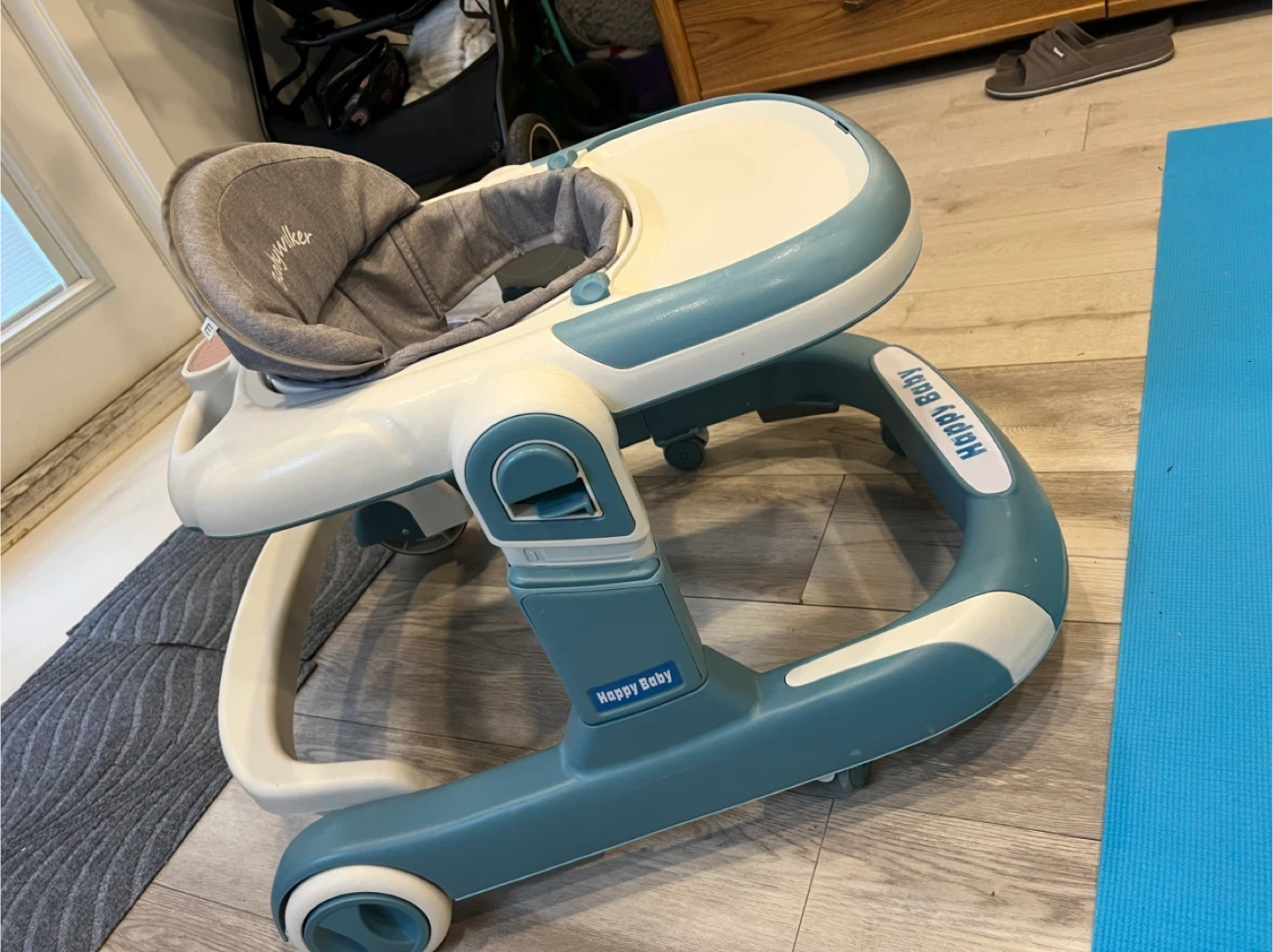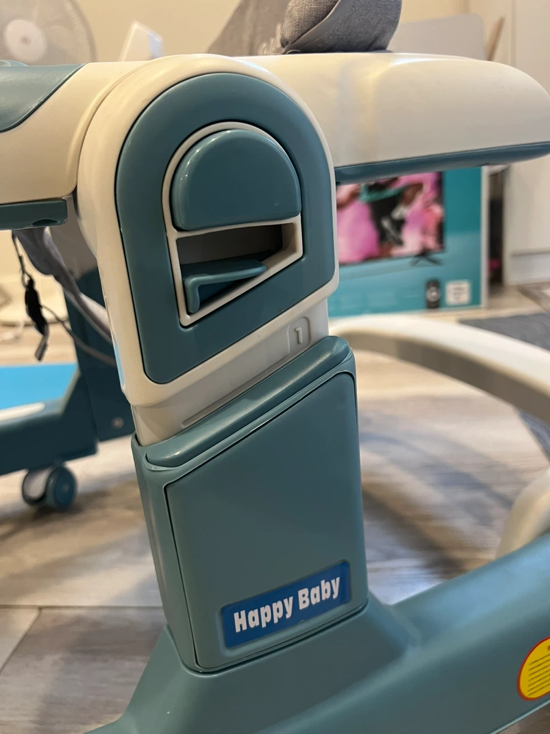 This is a Happy Baby, baby walker with a grey fabric seat.It’s also adjustable height. It's white and teal in colour. It has a tray attached to the front for snacks or toys.