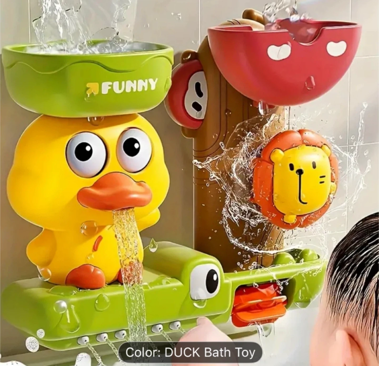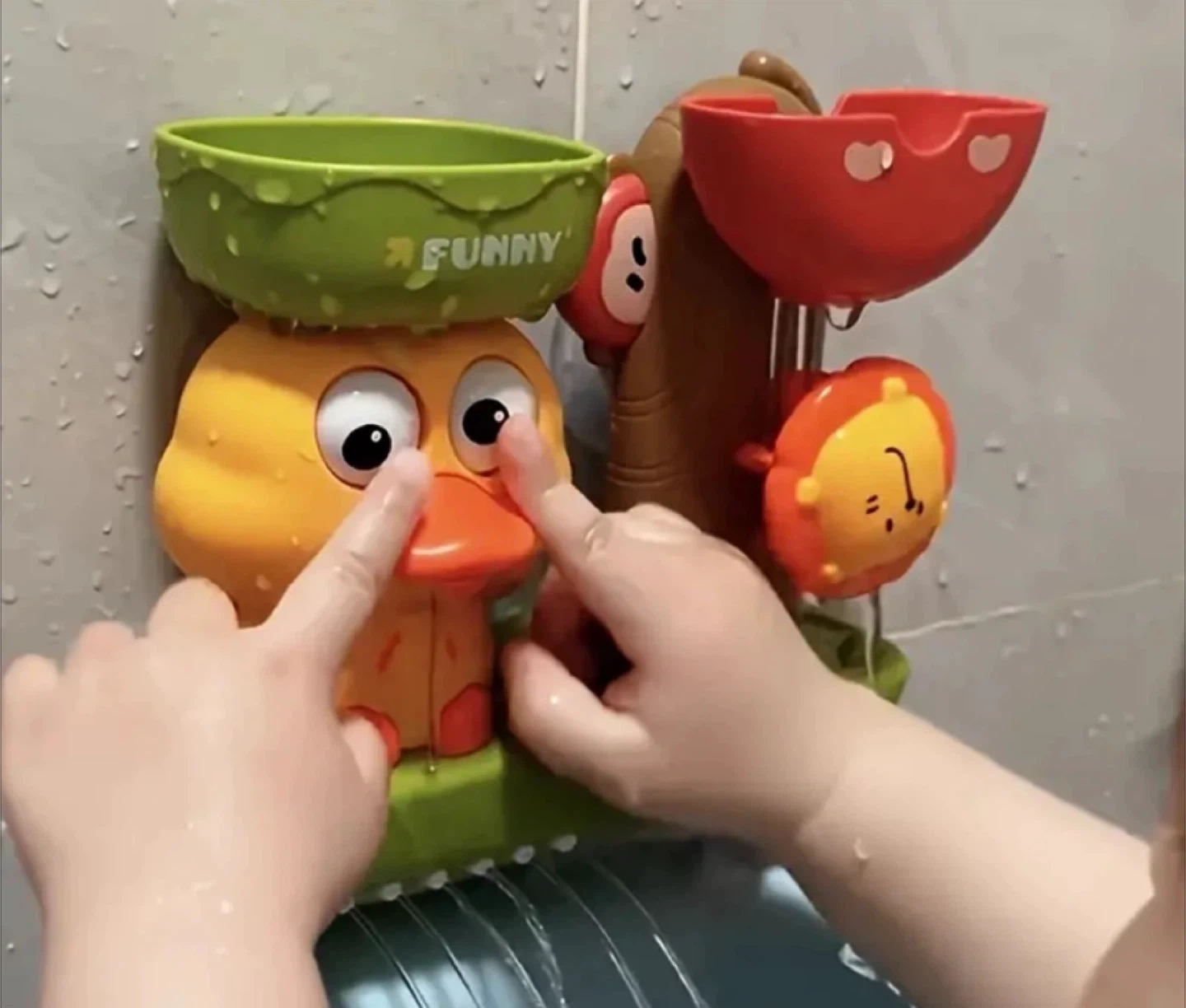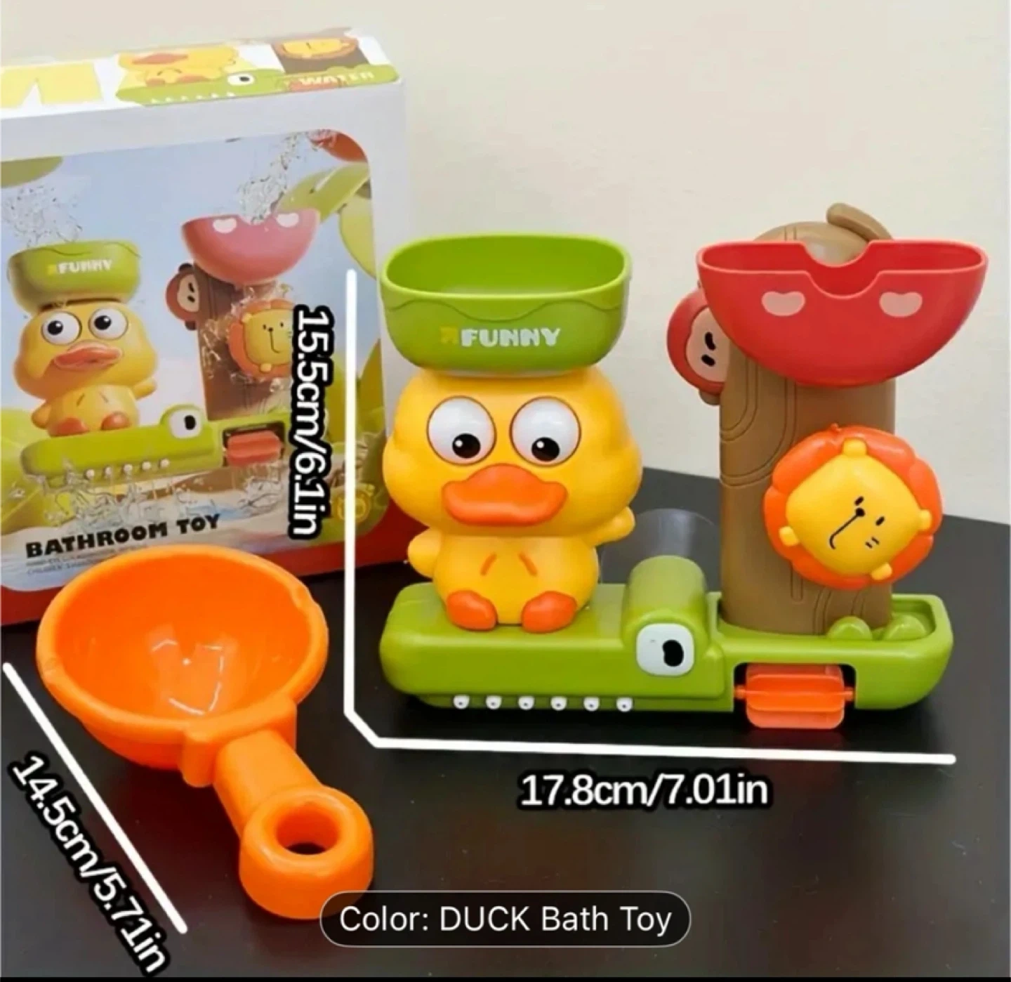 This is a Funny brand duck-themed bathroom water toy. It's made of plastic and comes with an orange scoop. It's designed for bath time fun! Kids can pour water into the top to make it flow through the different levels.