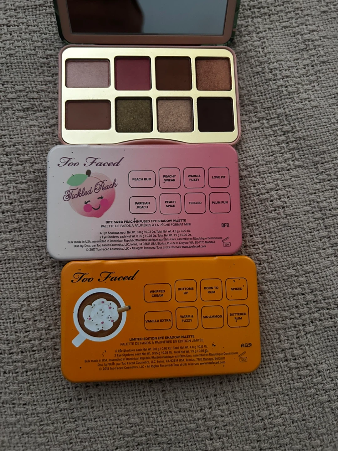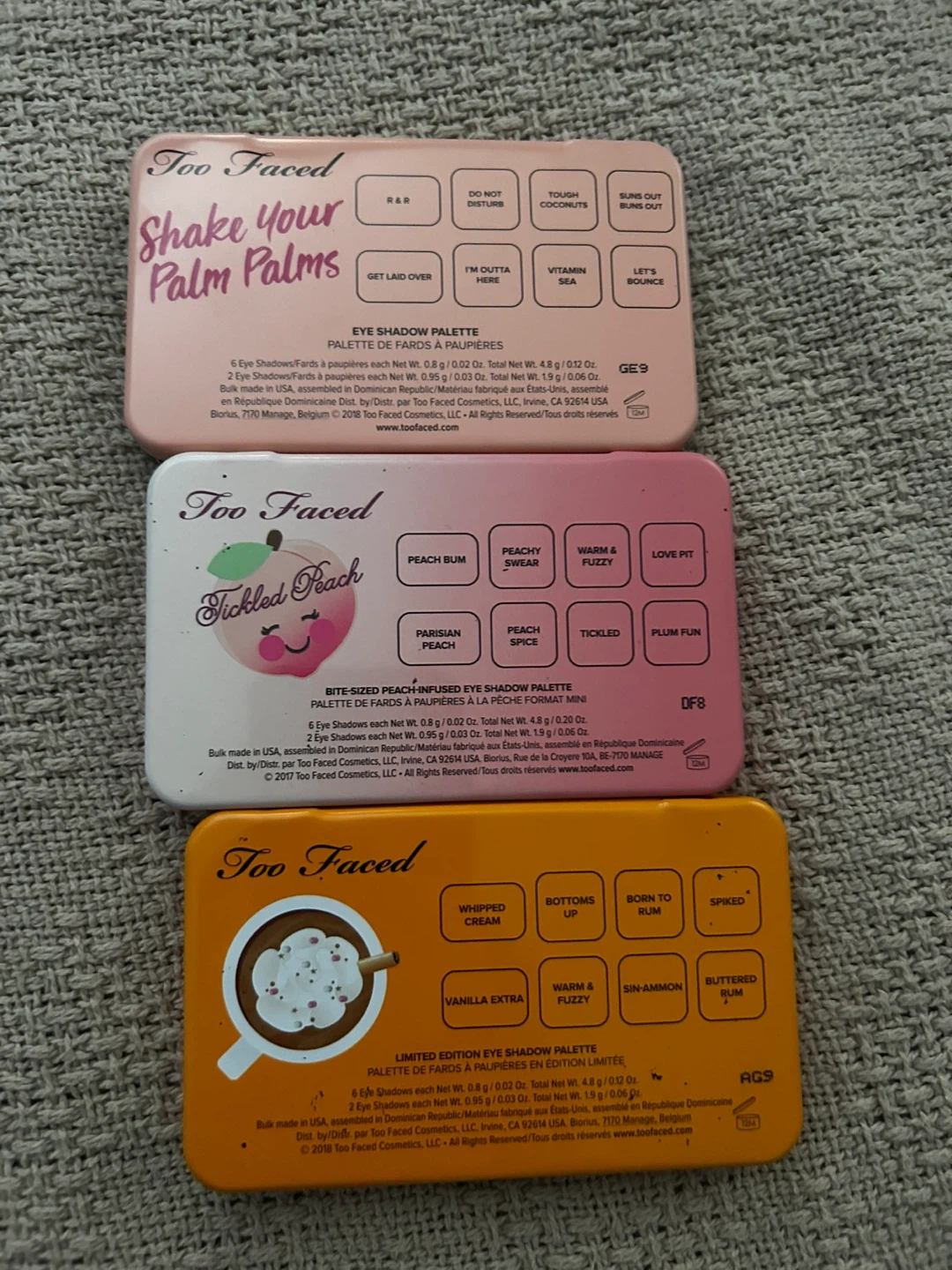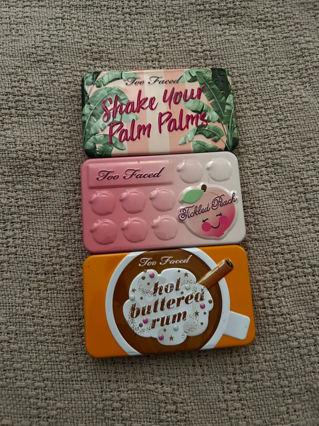 Selling a bundle of three Too Faced eyeshadow palettes: Shake Your Palm Palms, Tickled Peach, and Limited Edition Hot Buttered Rum. Each palette contains 6 eyeshadows and a mirror.