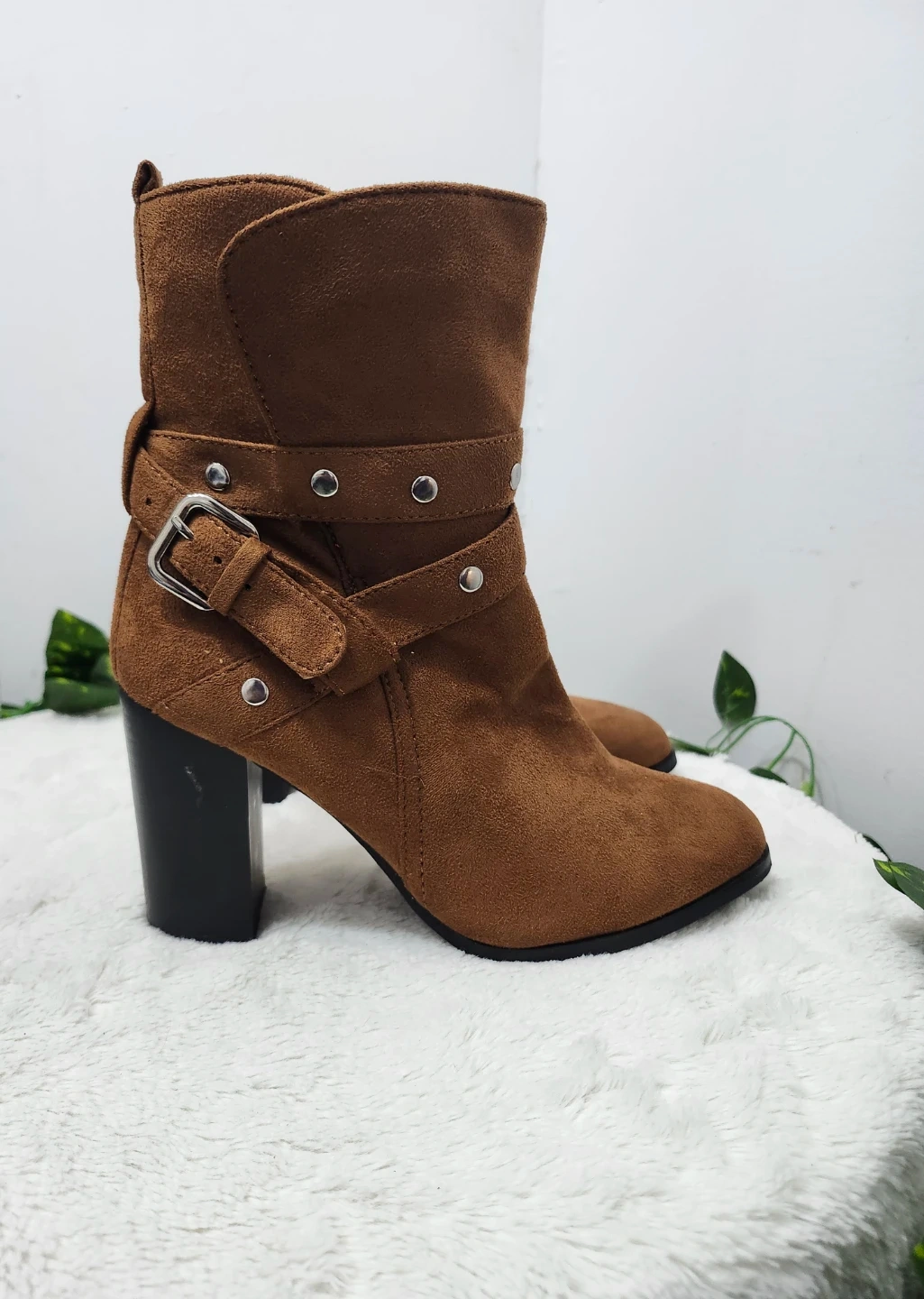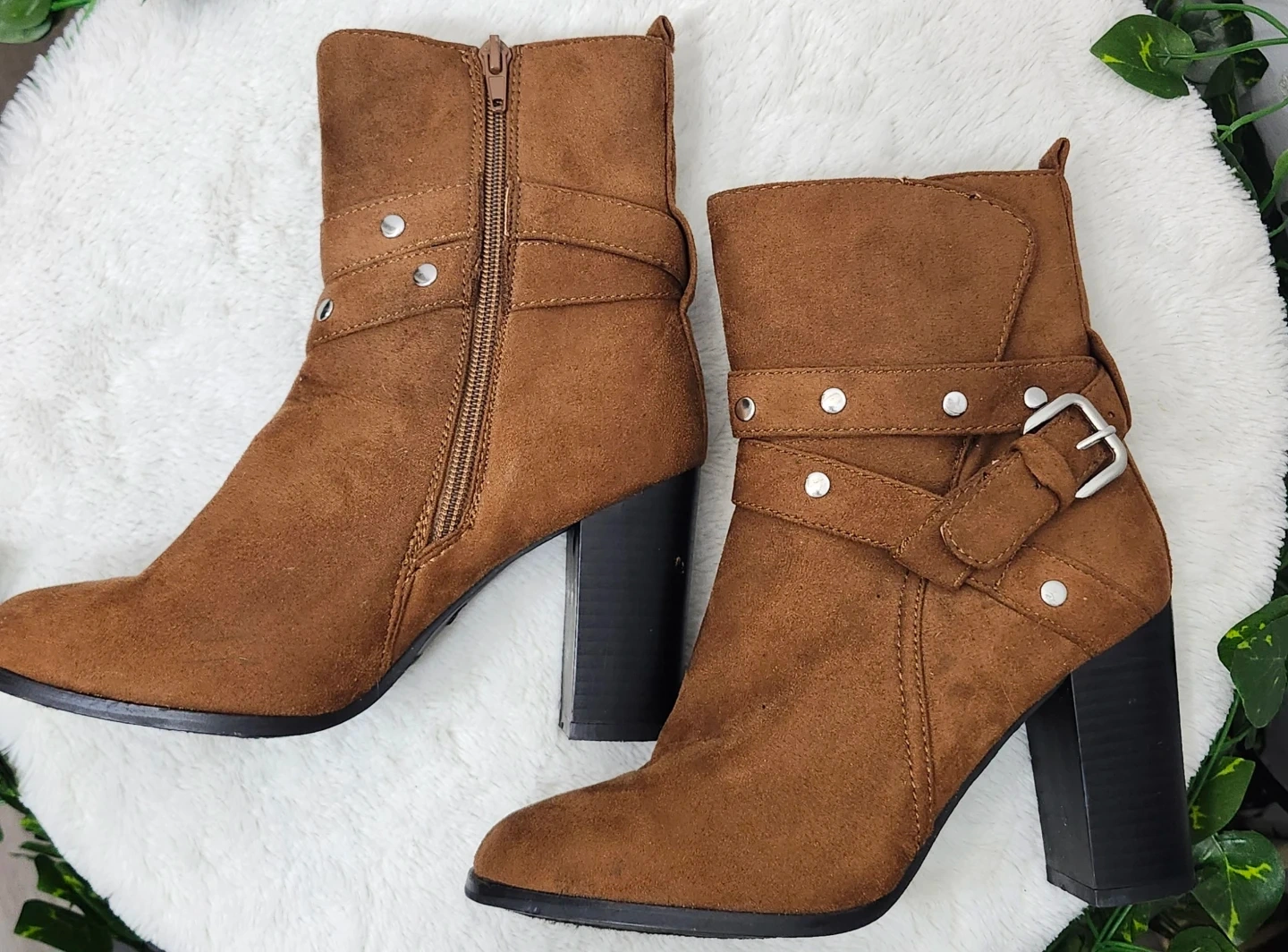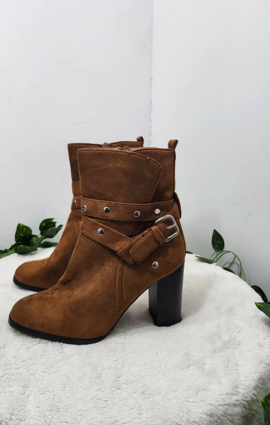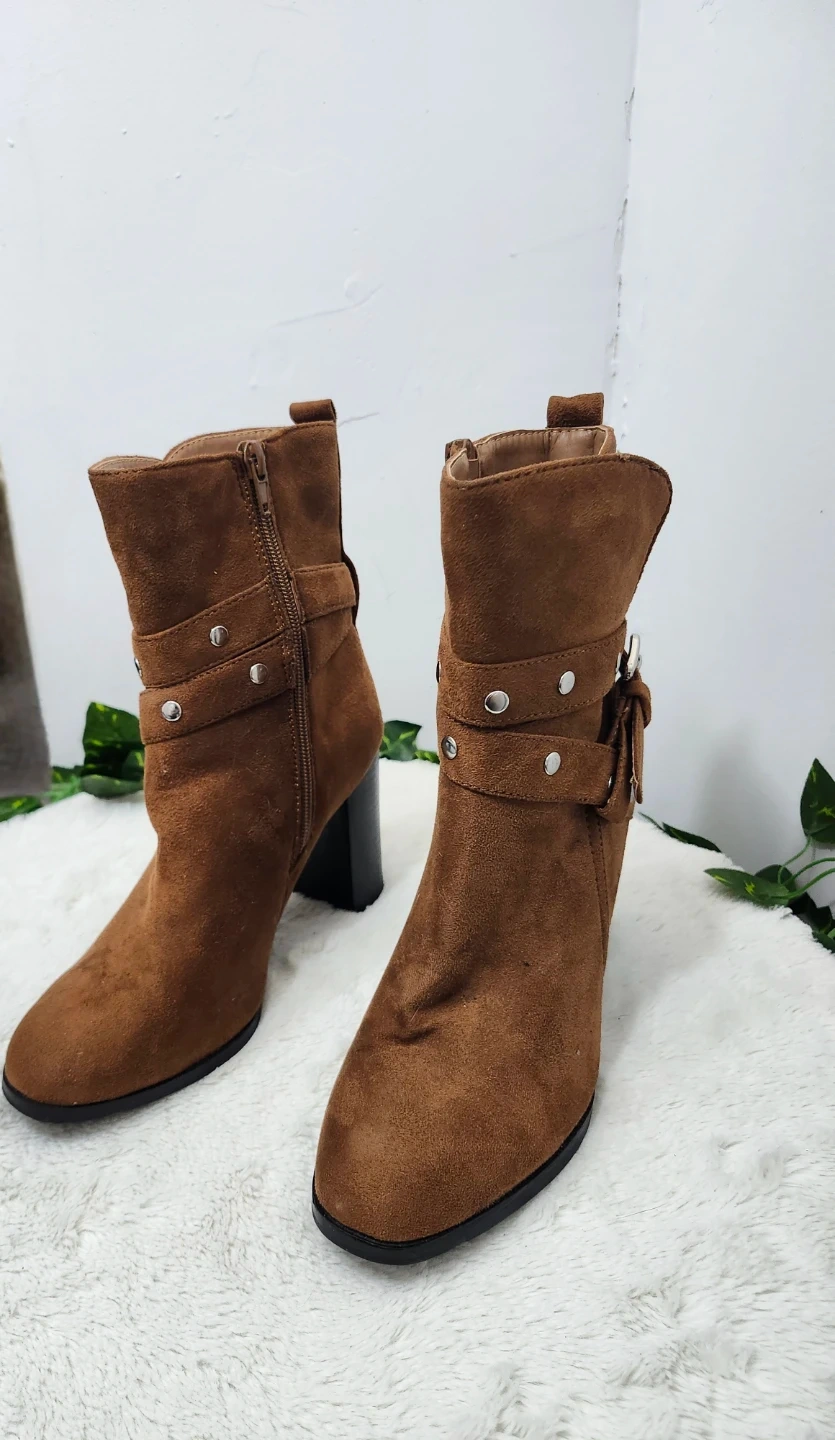 These stylish ankle boots are made from a soft brown faux suede material. They feature a side zipper and adjustable buckle straps with stud accents. The chunky block heel offers a comfortable lift.