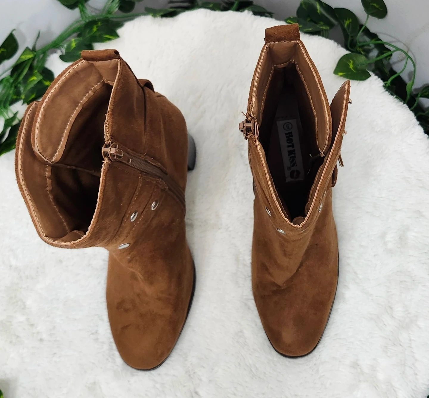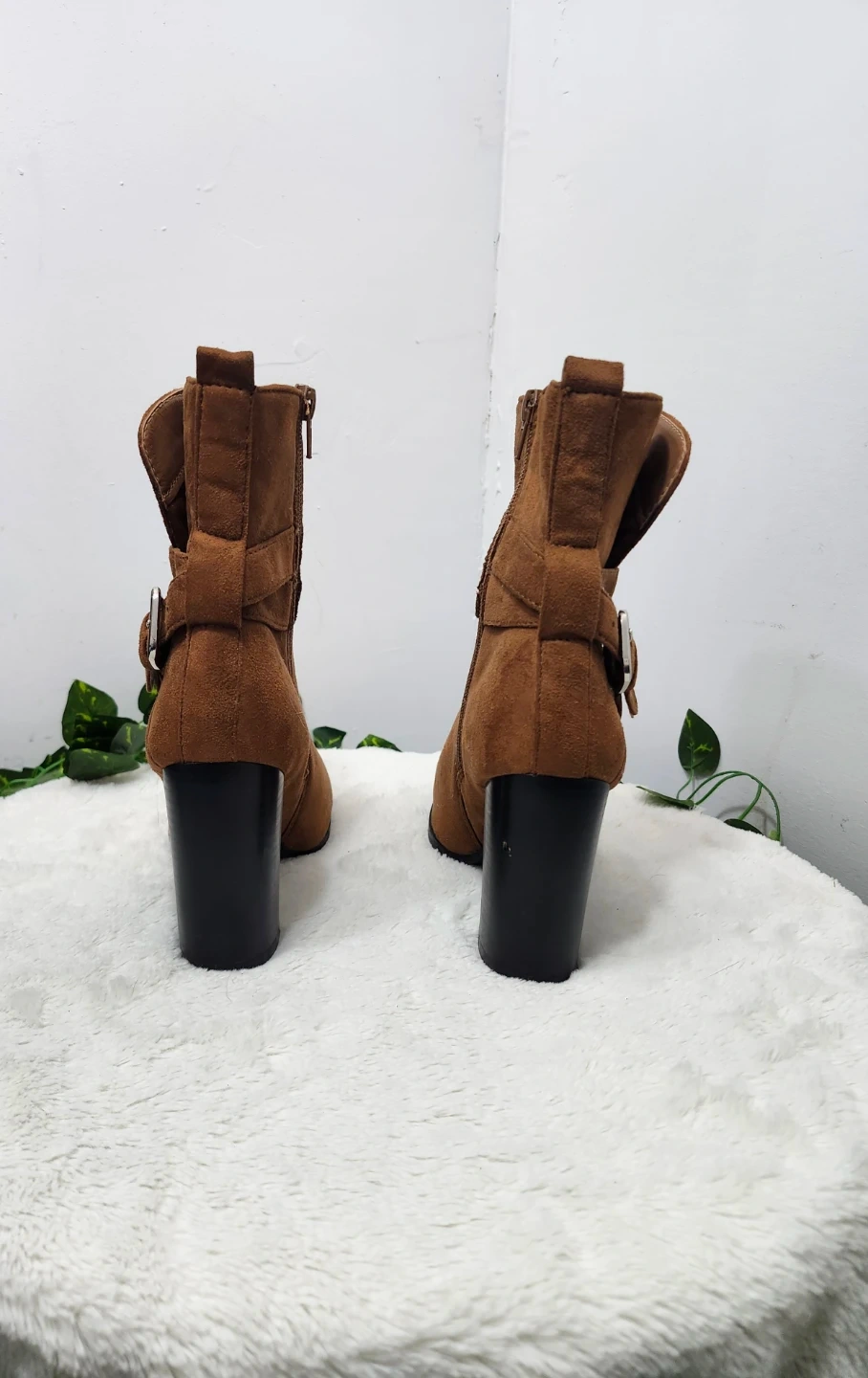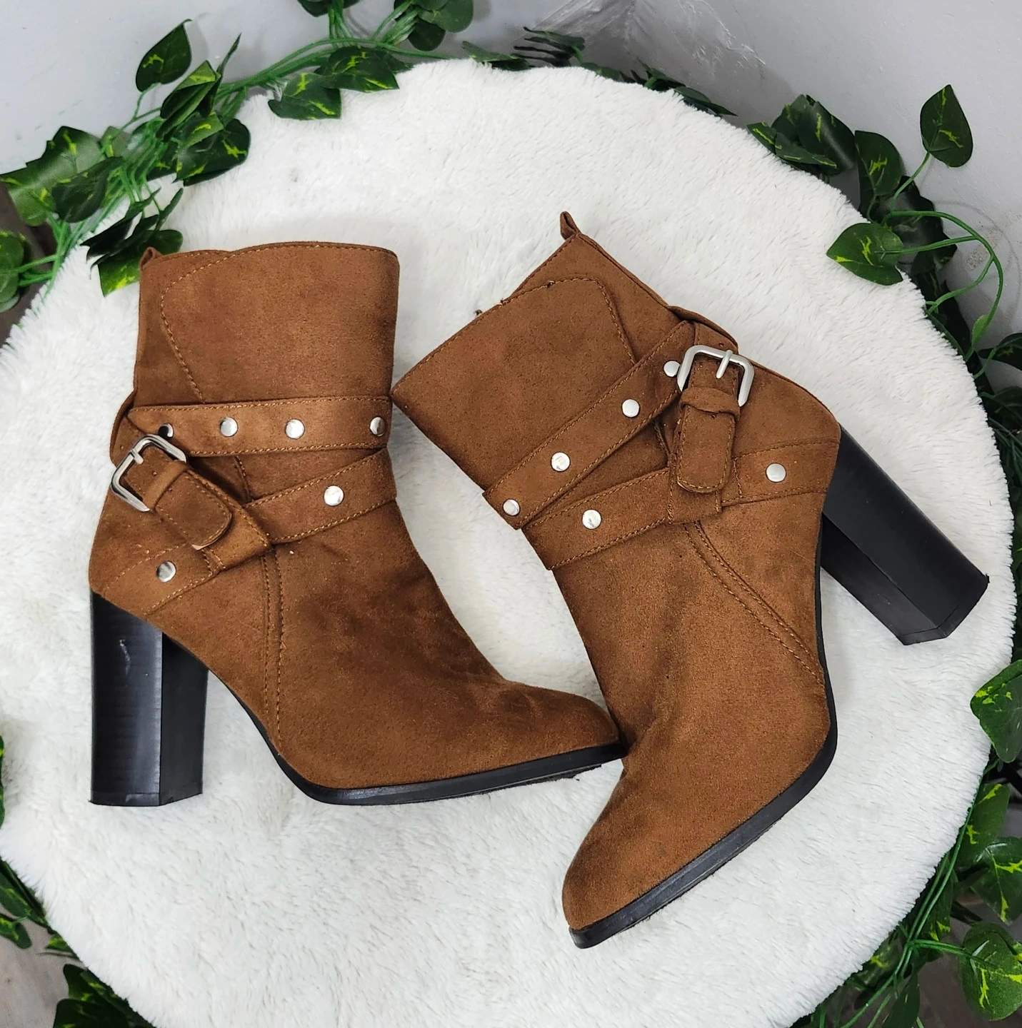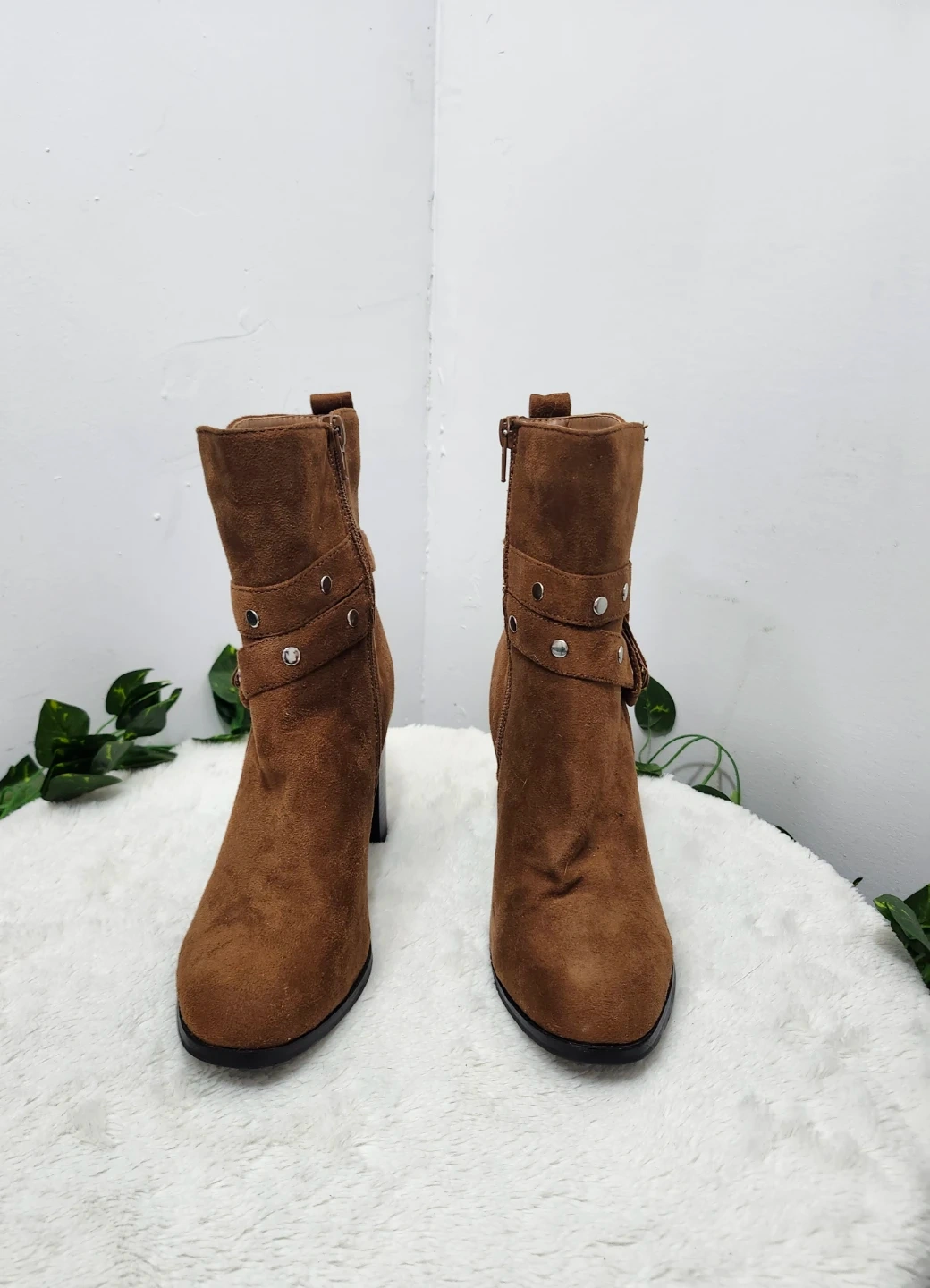 These stylish ankle boots are made from a soft brown faux suede material. They feature a side zipper and adjustable buckle straps with stud accents. The chunky block heel offers a comfortable lift.