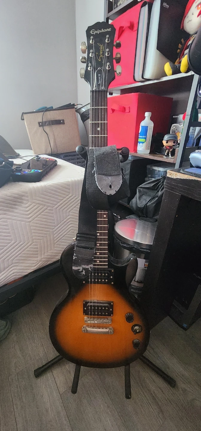 Epiphone electric guitar with a sunburst finish and black accents. It comes with a small amplifier and a black gig bag. And a stand. This electric guitar set is great for learning to play!