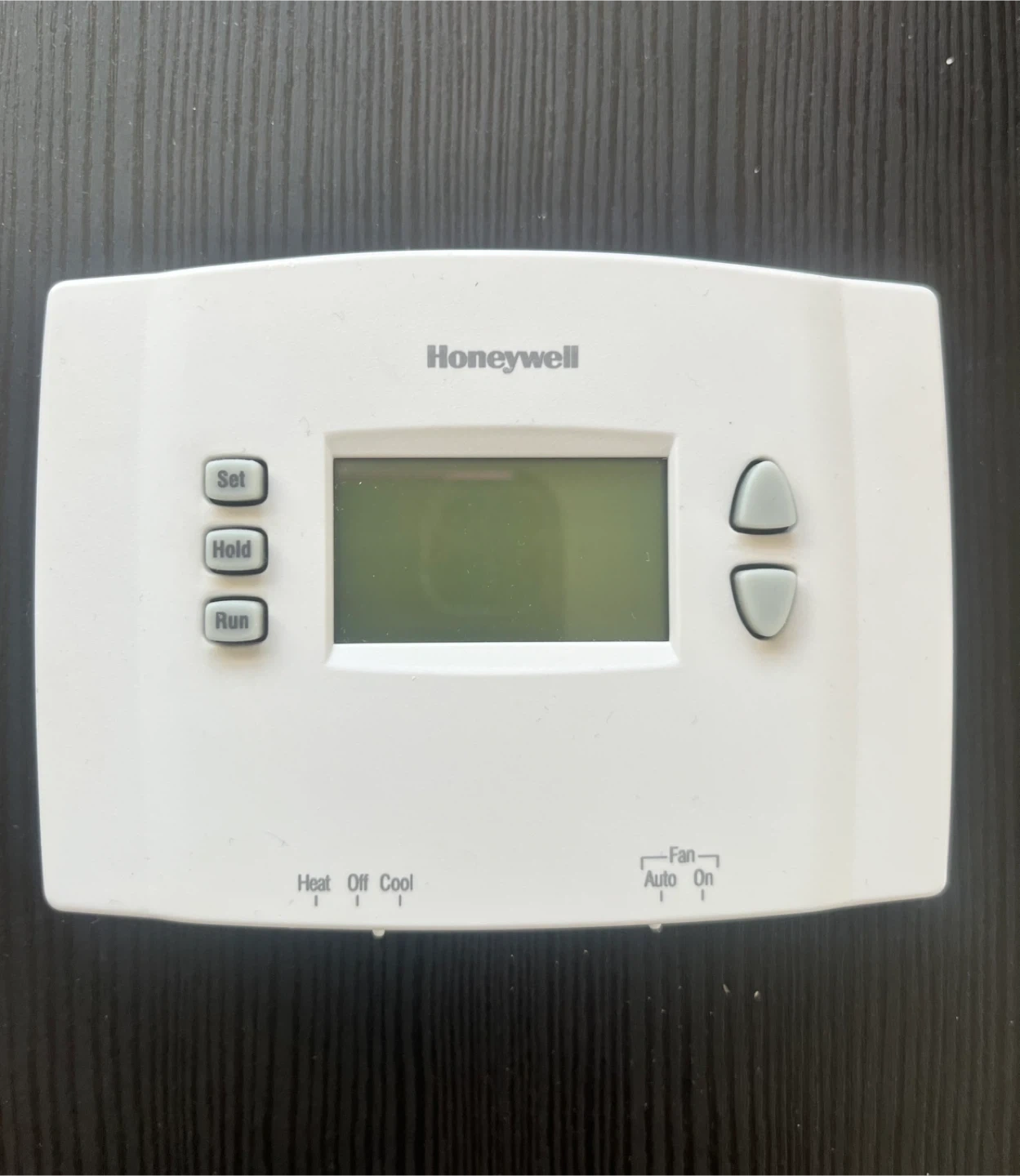 White Honeywell programmable thermostat. Features heat, off, and cool settings with fan auto and on options. Easy to use set, hold, and run buttons.