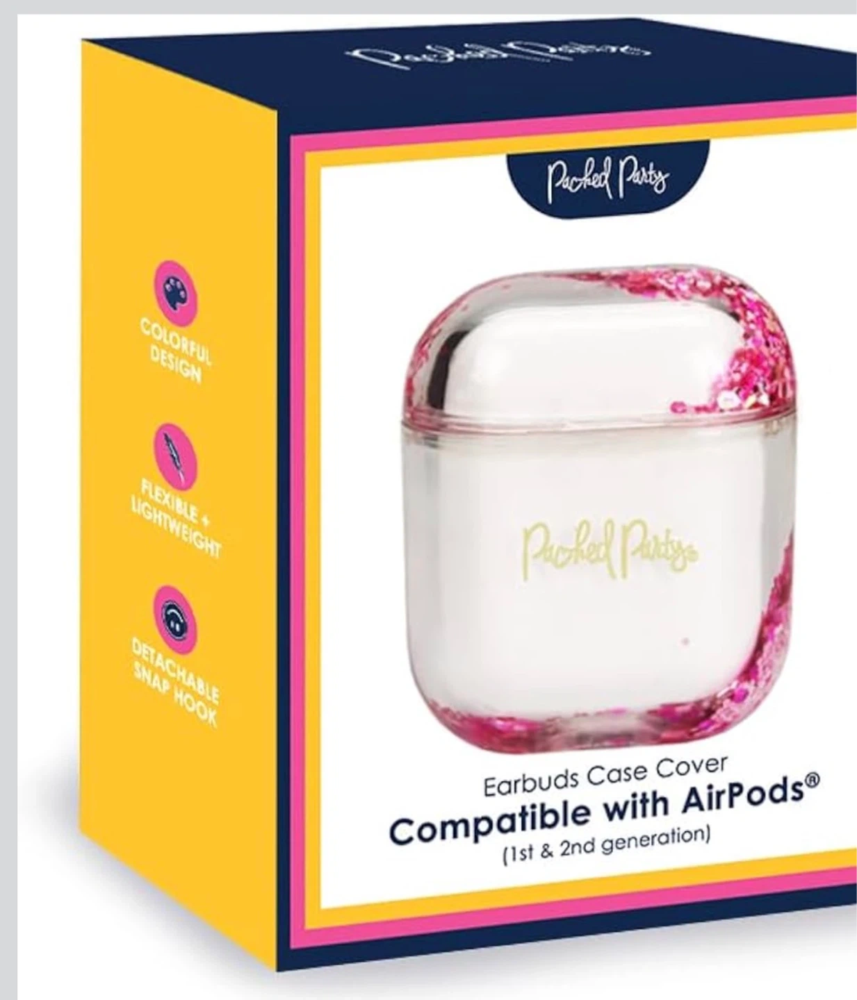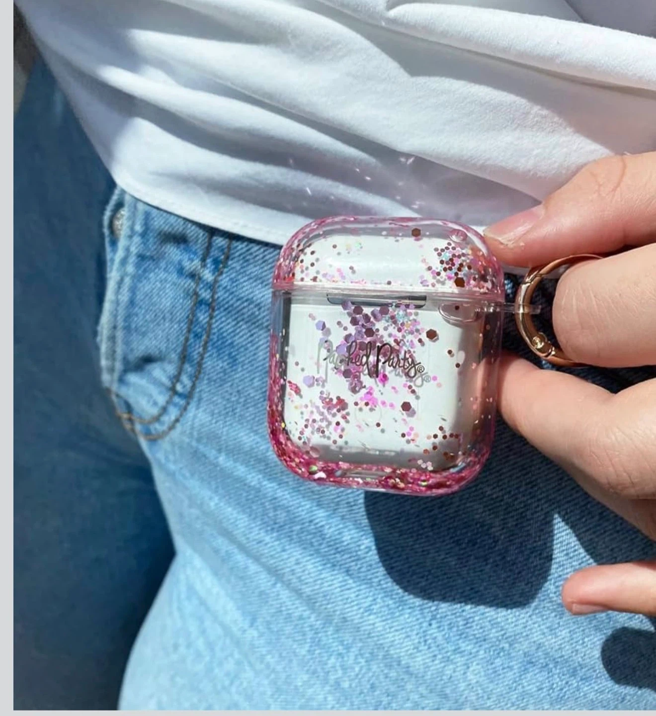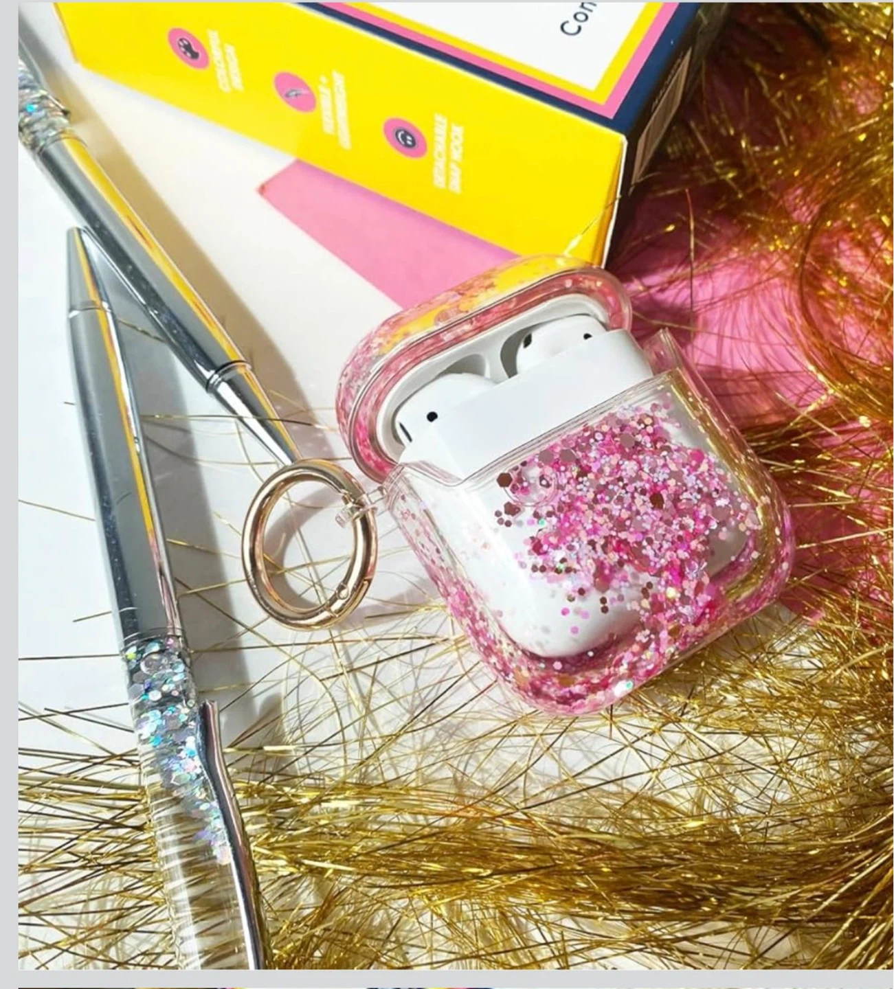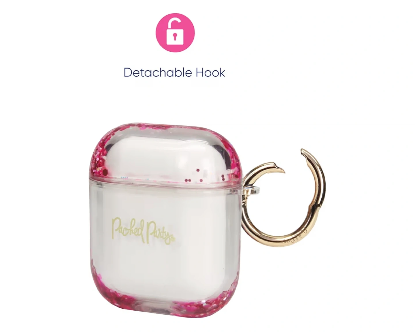 This clear case cover is compatible with 1st and 2nd generation AirPods. It has a colourful glitter design and includes a detachable snap hook for easy carrying. It also offers easy access to the charging port.