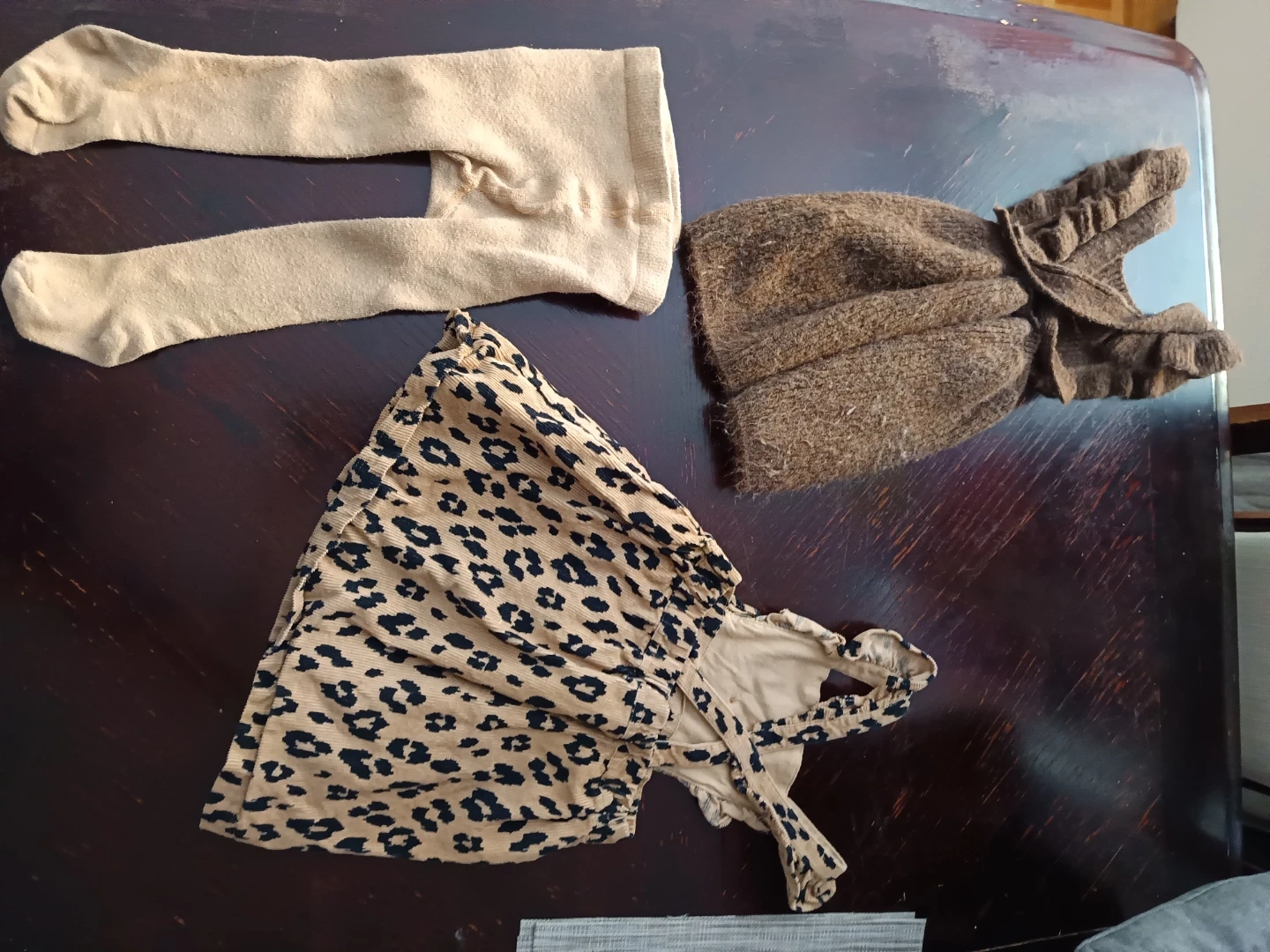 This is a cute set for a toddler. It includes a leopard print dress with ruffled details. Also included are a pair of tan tights and a brown knit sweater with ruffles. It's a sweet outfit for a little one!