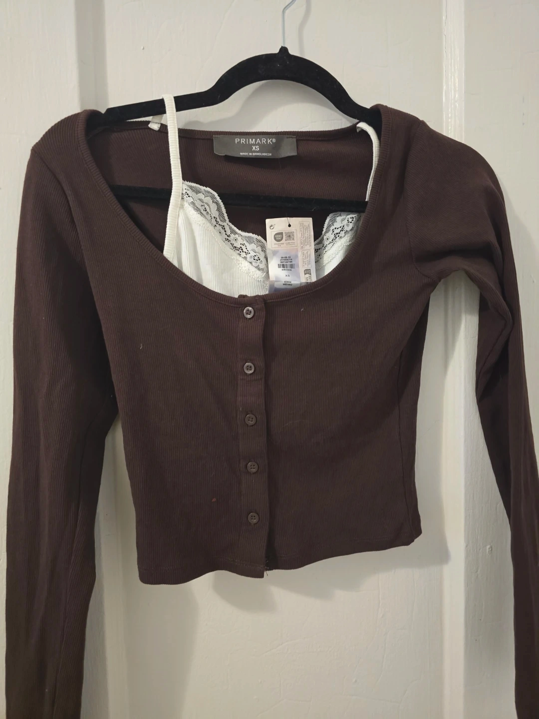 This is a brown ribbed cropped cardigan from Primark in size XS. It features a button-up front and a white camisole with lace trim peeking out. Made in Bangladesh.