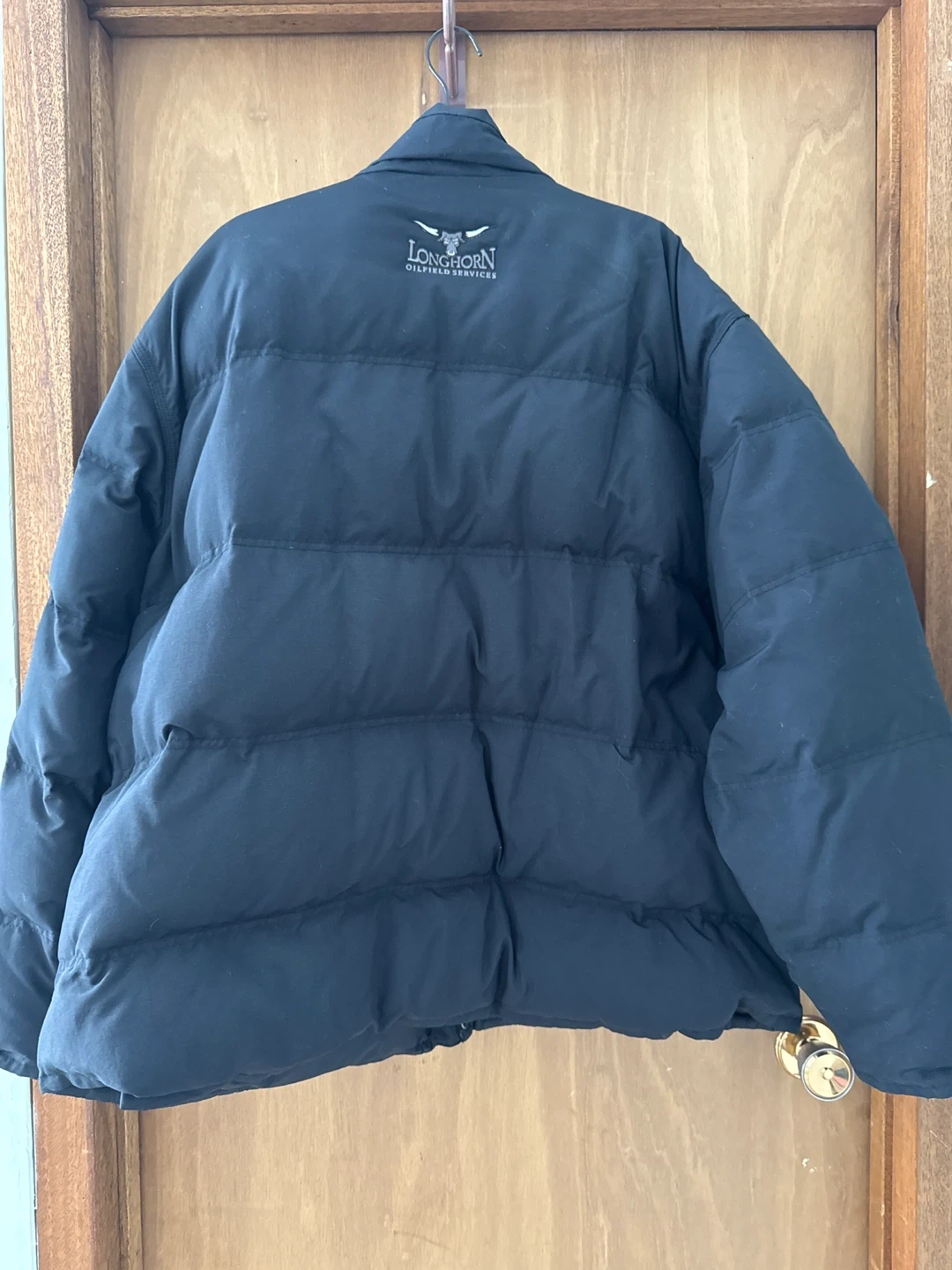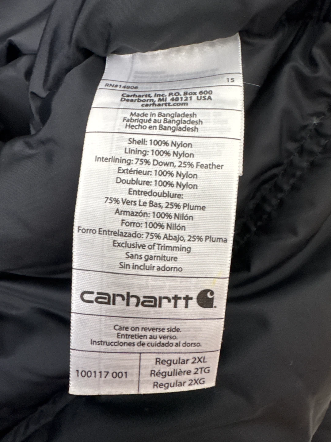 This black Carhartt puffer jacket is a size 2XL. It's made with a 100% nylon shell and lining, and the interlining is 75% down and 25% feather. Great for staying warm!