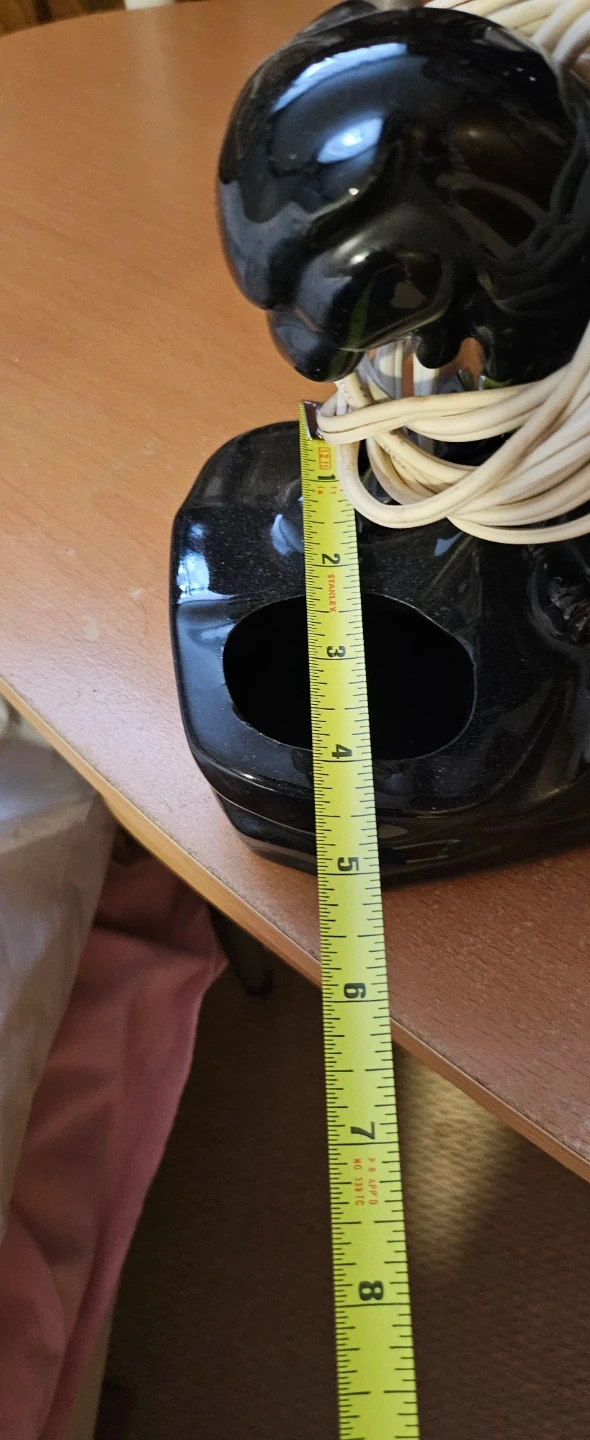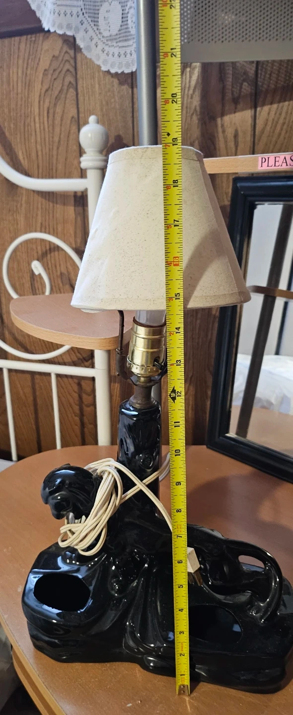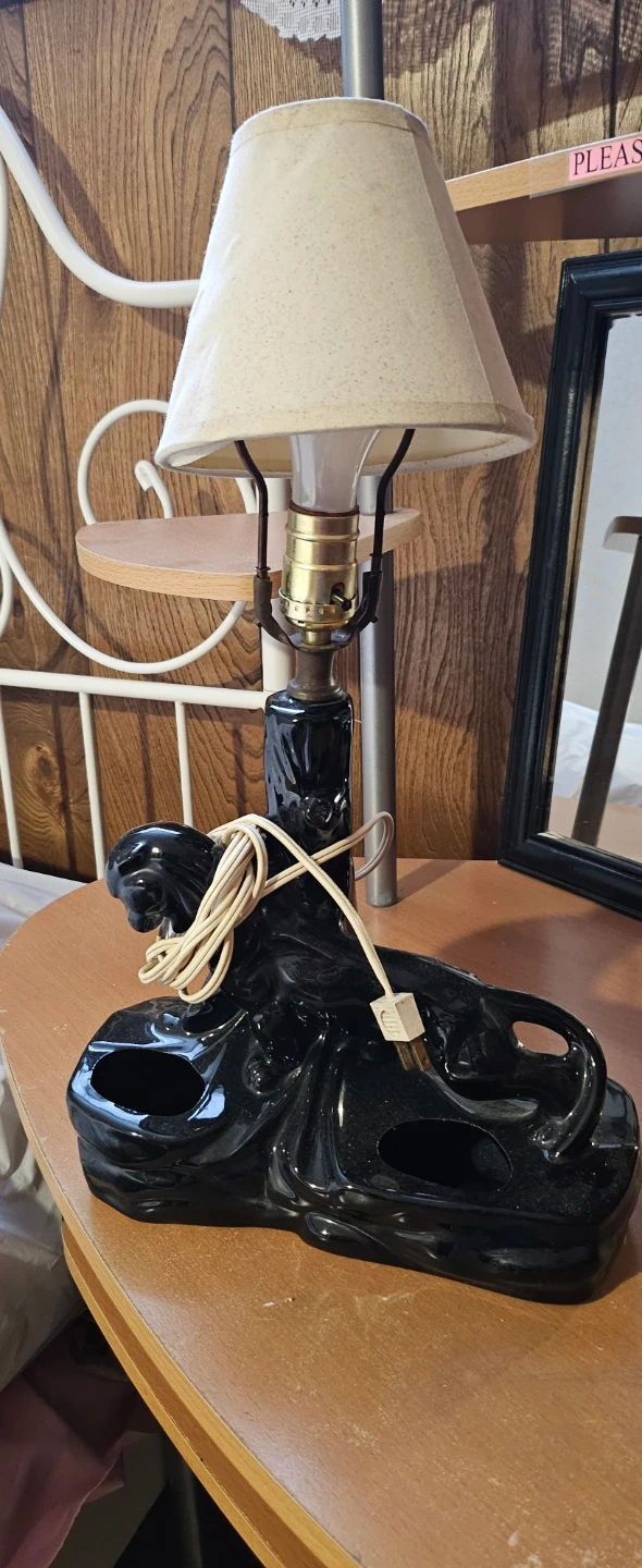 This vintage lamp features a black ceramic panther design. It's approximately 11 inches long and 4 inches high at the base. The lamp has two circular openings in the base, possibly for ashtrays. It's a unique accent piece for any room!