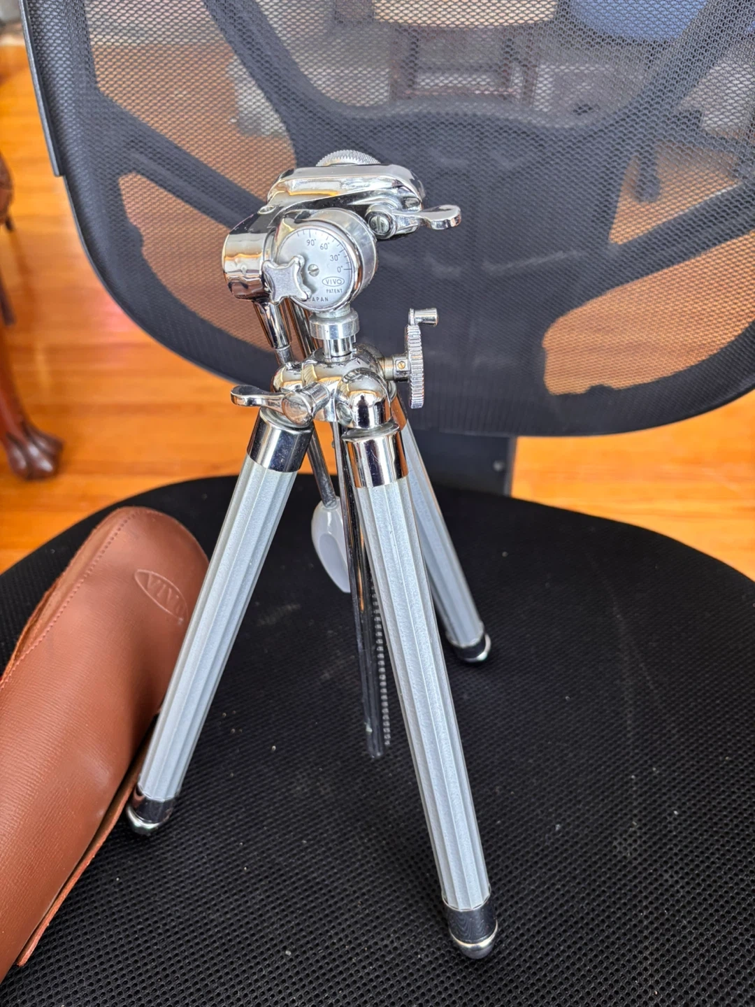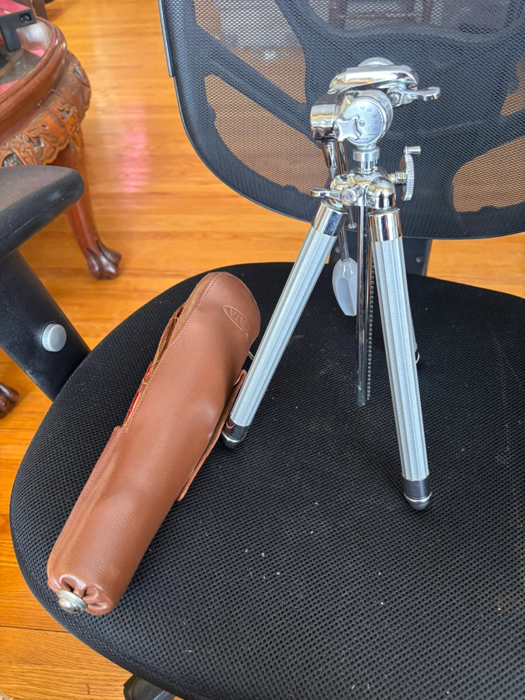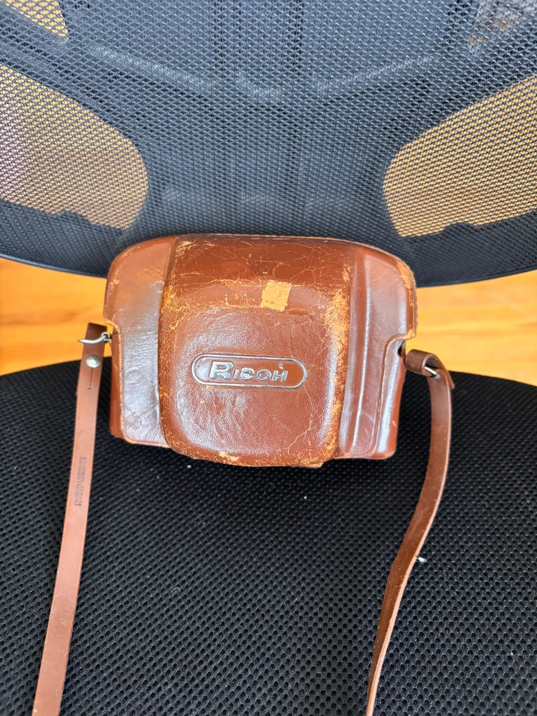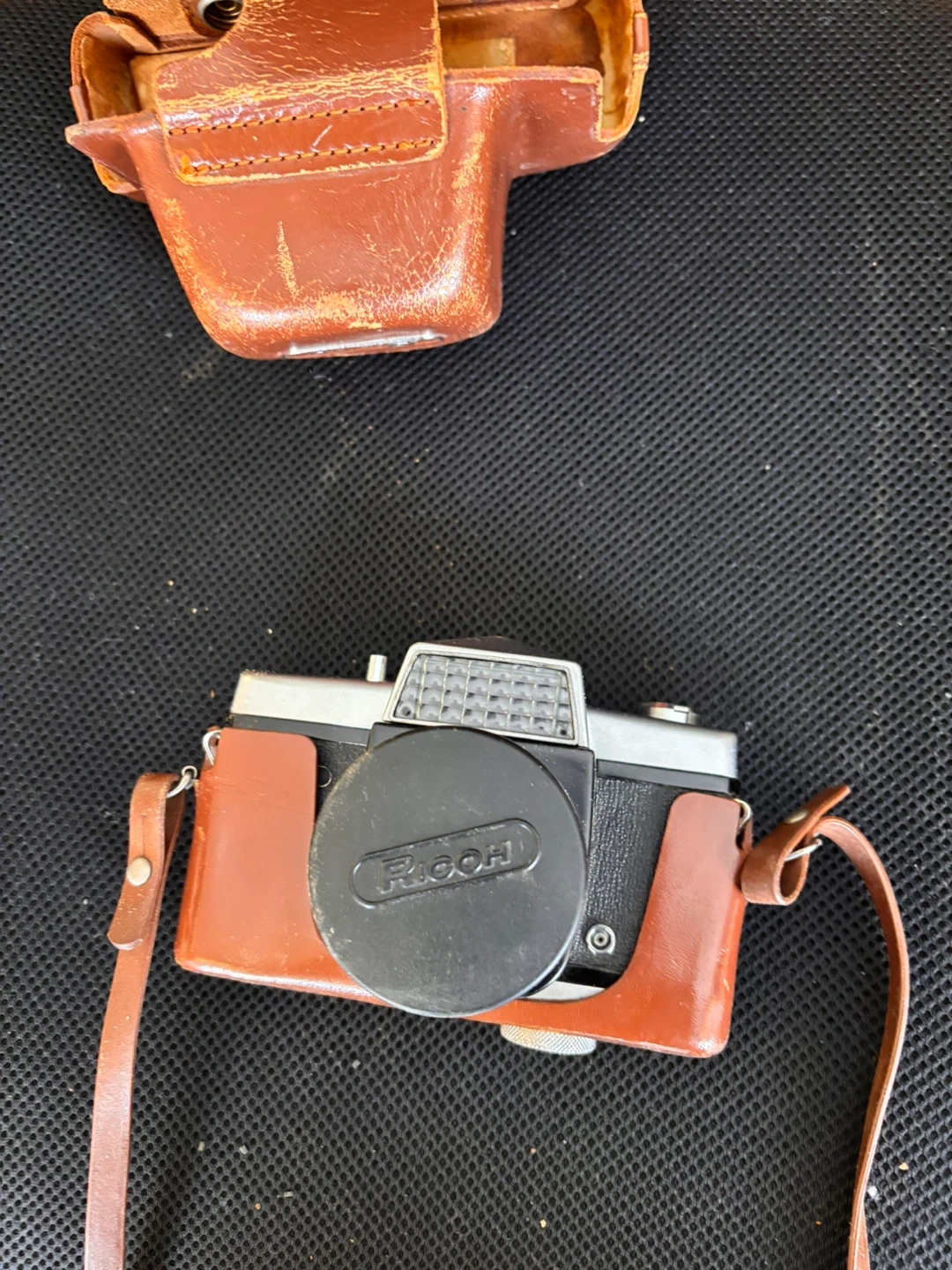 Vintage Ricoh 35 Flex camera with its original brown leather case and strap. Also includes a compact chrome mini tripod with a brown leather case. A neat setup for film photography enthusiasts!