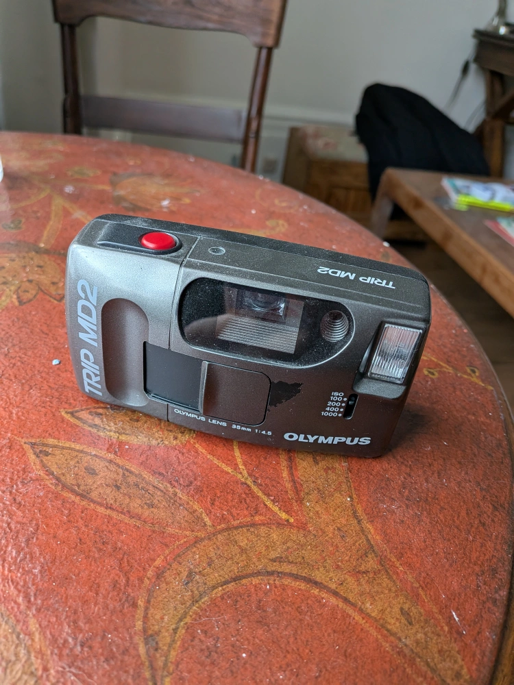 Olympus Trip MD2 point-and-shoot 35mm film camera. Features a 35mm 1:4.5 lens and flash with ISO settings for 100, 200, 400, and 1000. Made in Taiwan.