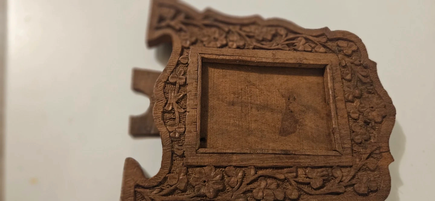 Wooden photo frame with intricate carvings. It has a stand on the back for display. Perfect for a memorable picture! A well displayed on office or computer desk with your favourite picture