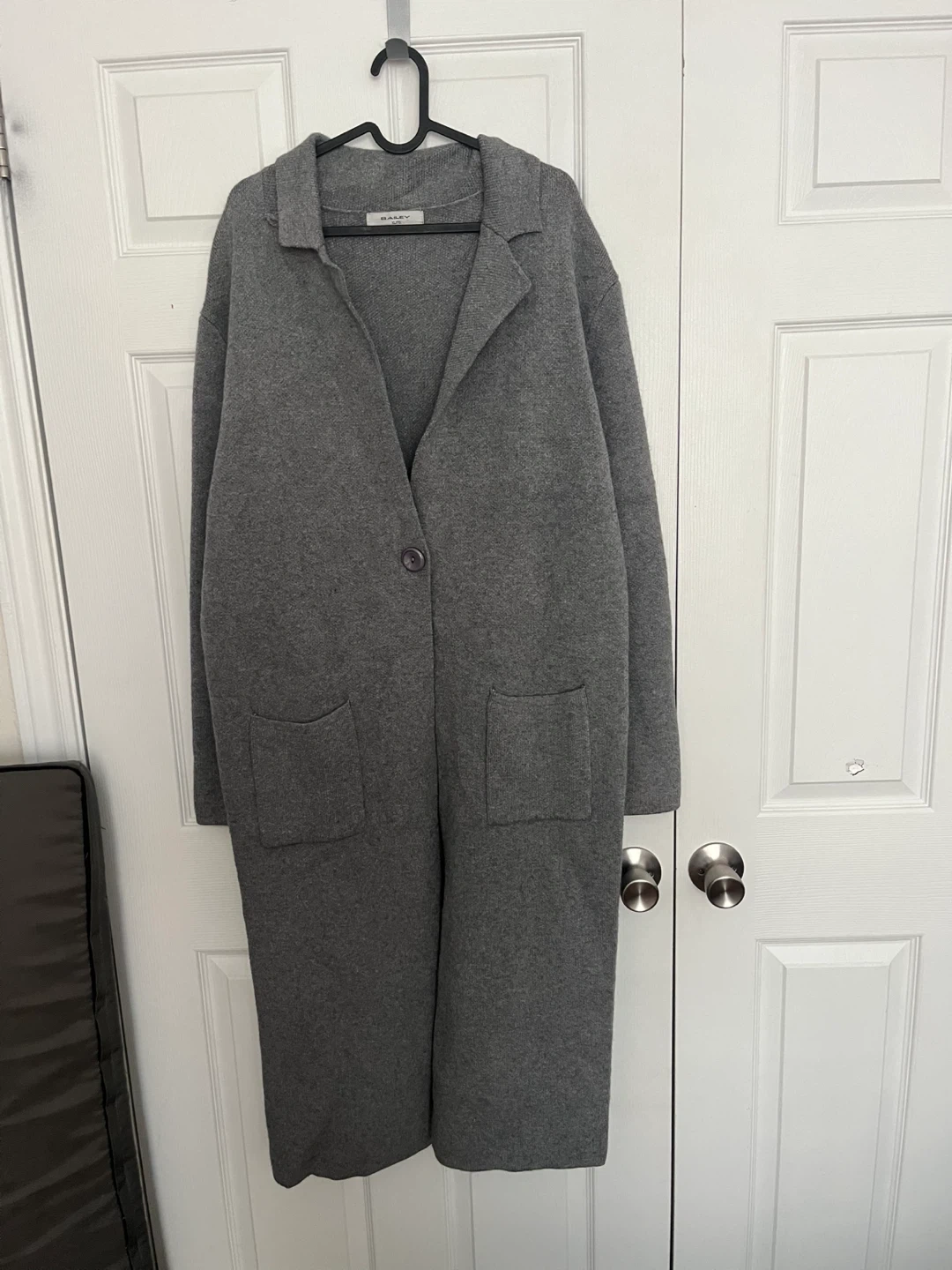 This is a long grey cardigan coat with two front pockets and one button closure. It's made of a soft knit material. A great layering piece for cooler weather!