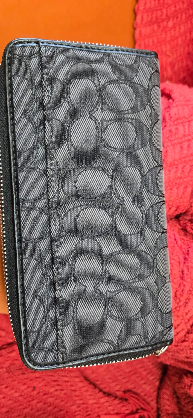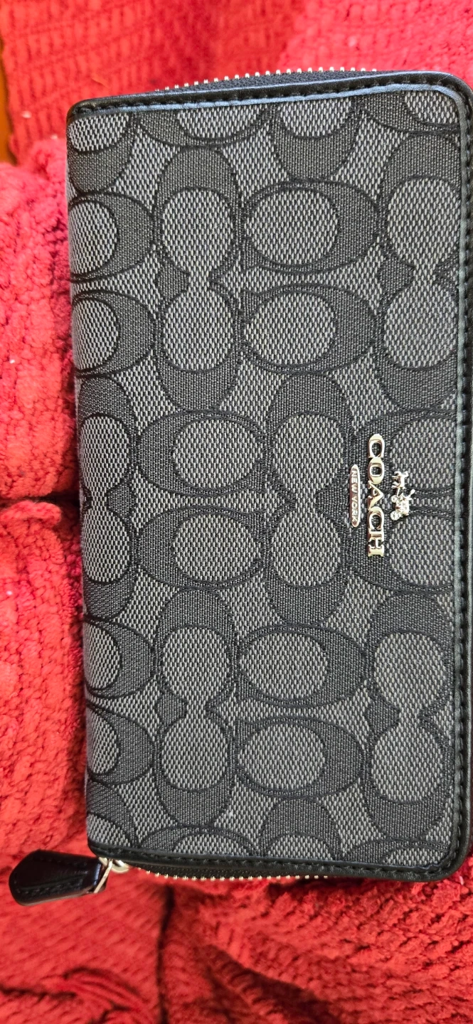 This is a Coach zip-around wallet with the classic C pattern. It's black and grey, and has multiple card slots and a zip pocket inside. It's great for organizing your essentials.