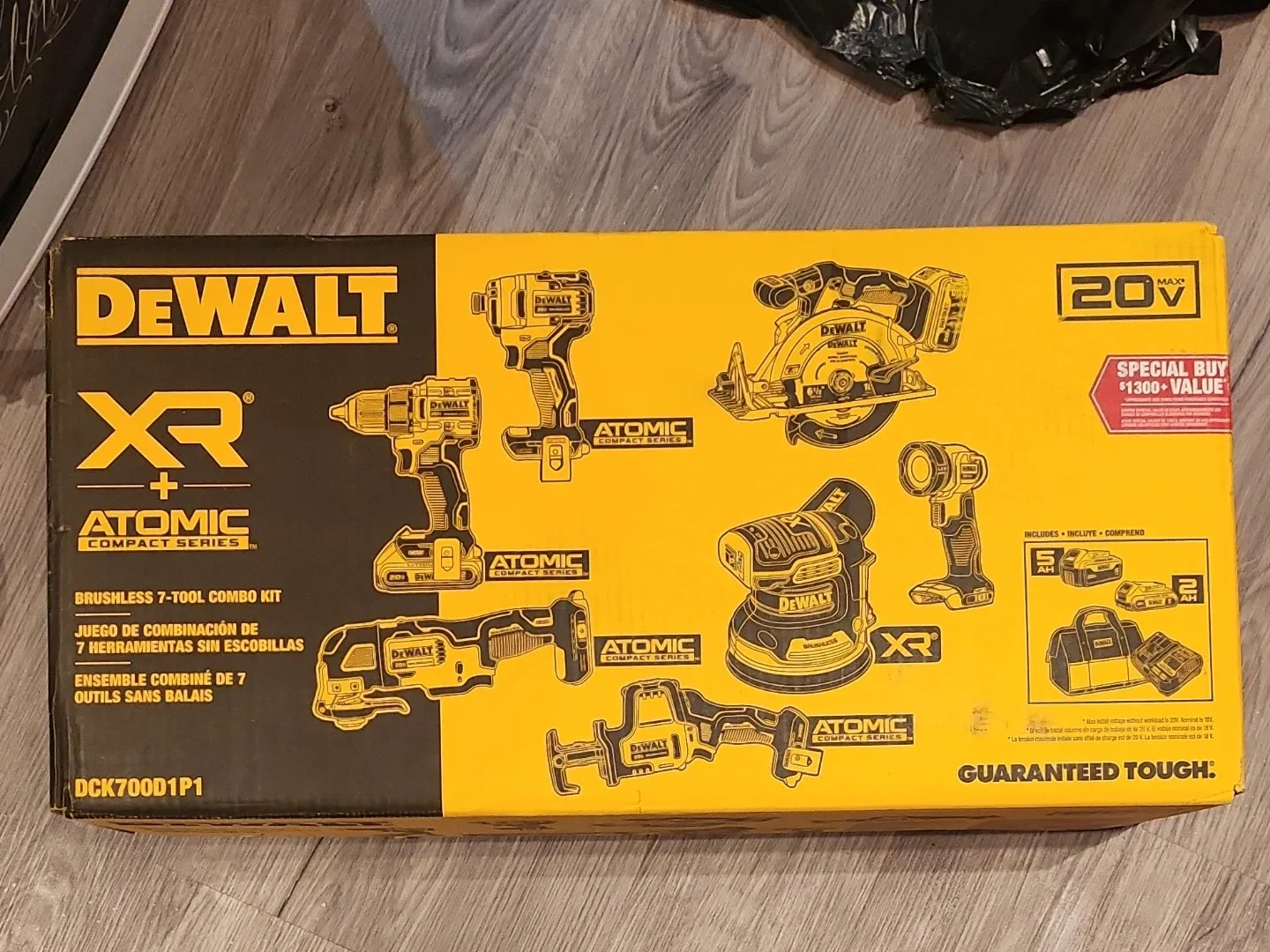 This DeWalt XR ATOMIC compact series brushless 7-tool combo kit comes with multiple batteries and a tool bag. It's designed for professional use. Includes 2.0 Ah and 5.0 Ah batteries.