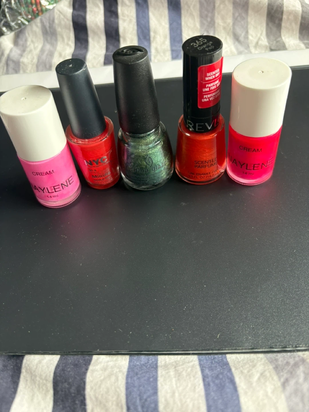 Five bottles of nail polish included. Two Naylene cream polishes in pink and neon pink, one NYC nail polish, one China Glaze polish, and one Revlon scented polish in orange.