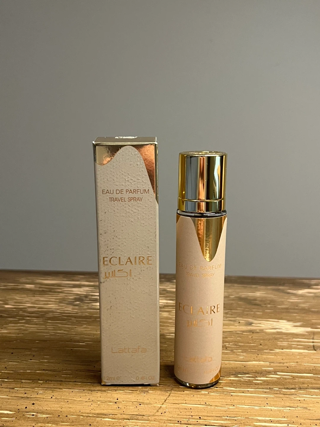 This is the Eclaire Eau de Parfum travel spray by Lattafa. It's a 12ml bottle, which is 0.4 fl oz. The bottle comes in its original packaging.