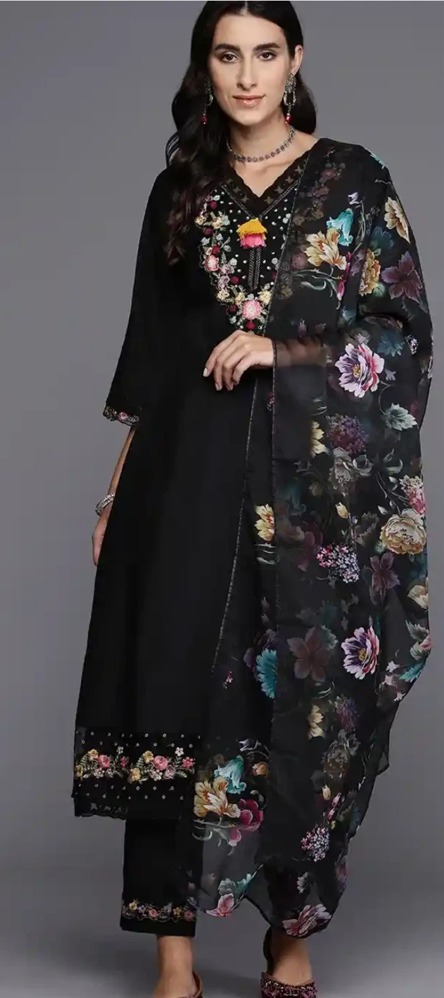 Indo Era Black Floral Embroidered Kurta with Trousers & Dupatta