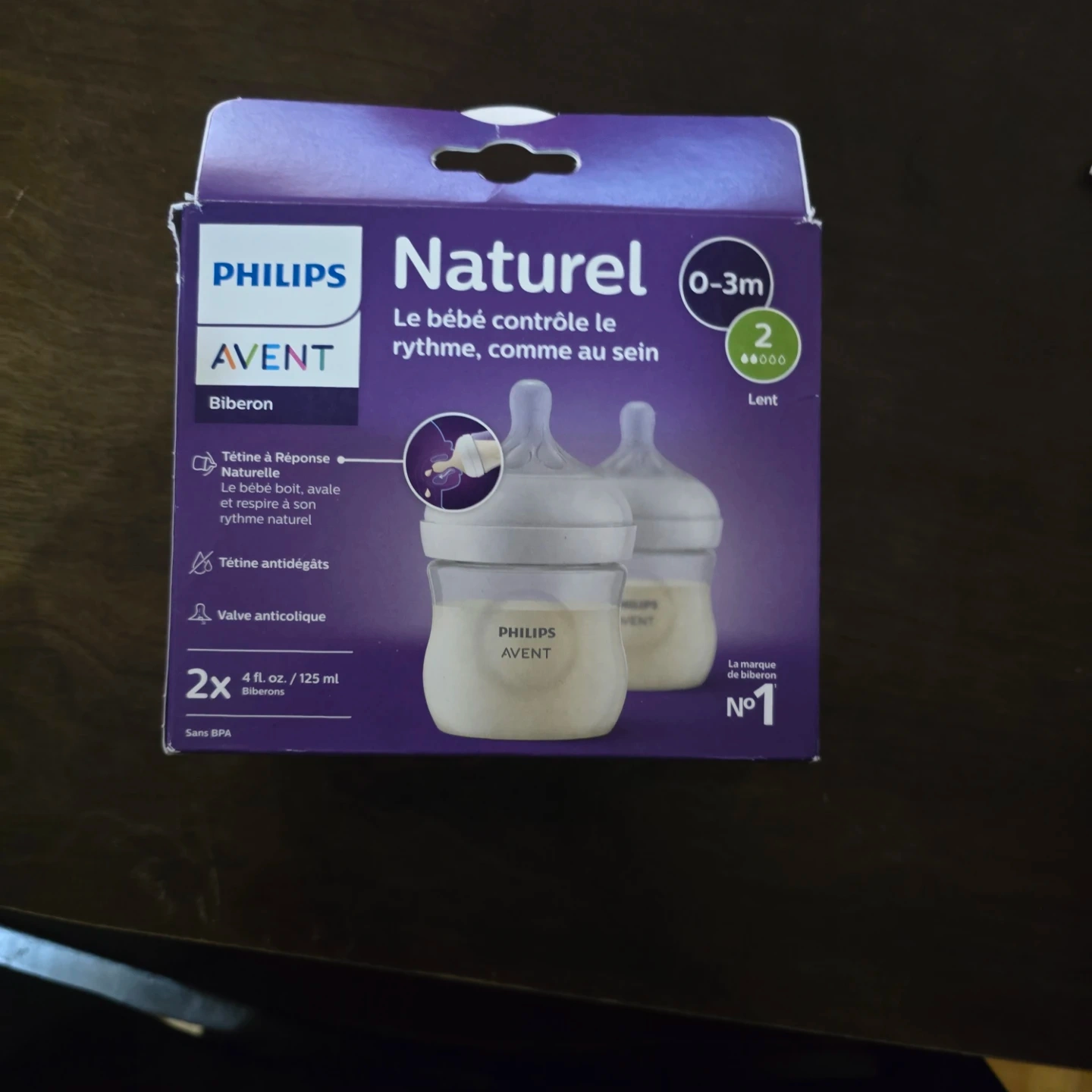 This is a 2-pack of Philips Avent Natural baby bottles, each with a 125 ml capacity. They feature a natural response nipple and an anti-colic valve. The bottles are BPA-free and designed for babies aged 0-3 months with a slow flow nipple.