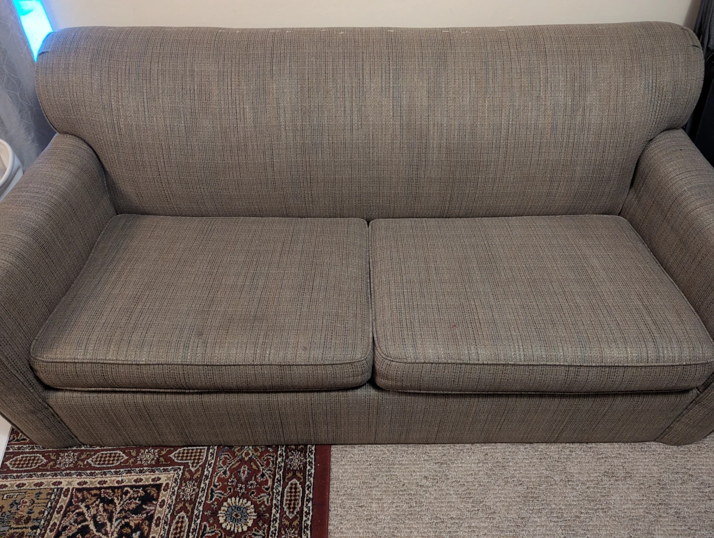 This sofa transforms into a bed with an included mattress. It's upholstered in a durable grey fabric. Perfect for overnight guests or small spaces!