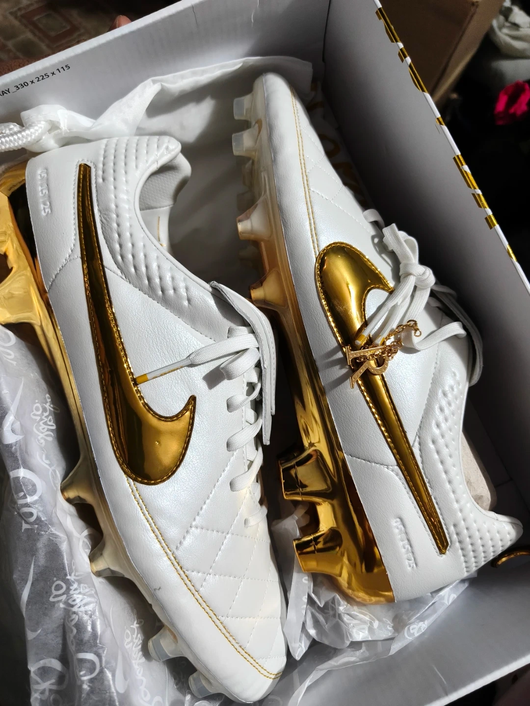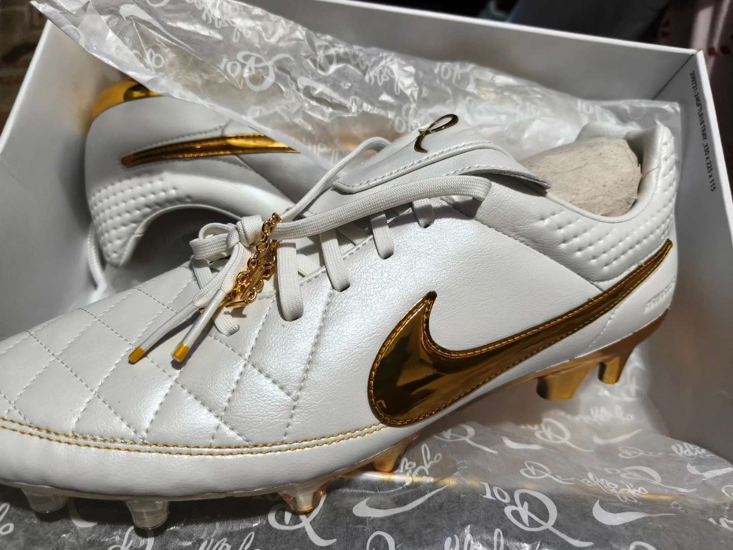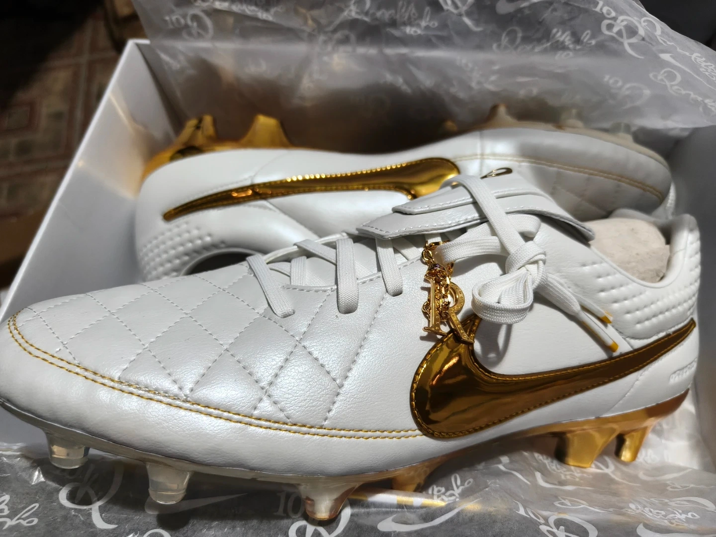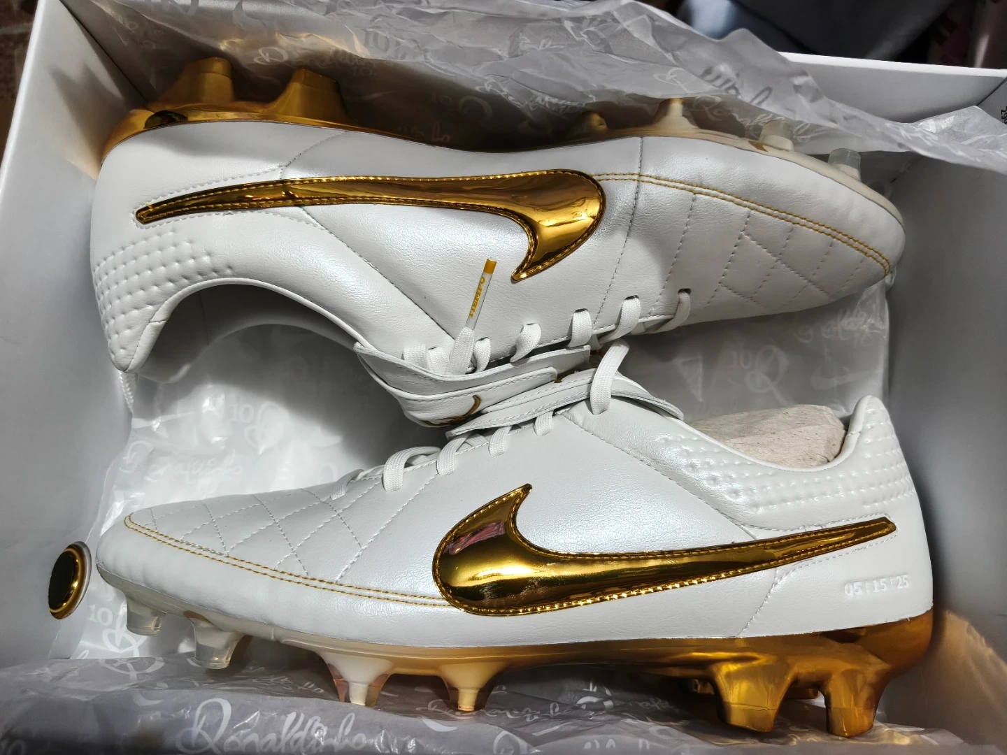 Selling a pair of Nike Tiempo Ronaldinho 10R FG soccer cleats in white and gold. These cleats are brand new in box. They feature the iconic Nike swoosh in gold and the Ronaldinho '10R' logo. The manufacturing date is 2025 May 15.