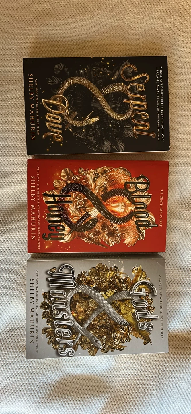 Three hardcover books from the Serpent & Dove series by Shelby Mahurin. Includes 'Serpent & Dove', 'Blood & Honey', and 'Gods & Monsters'. Great for fantasy readers!