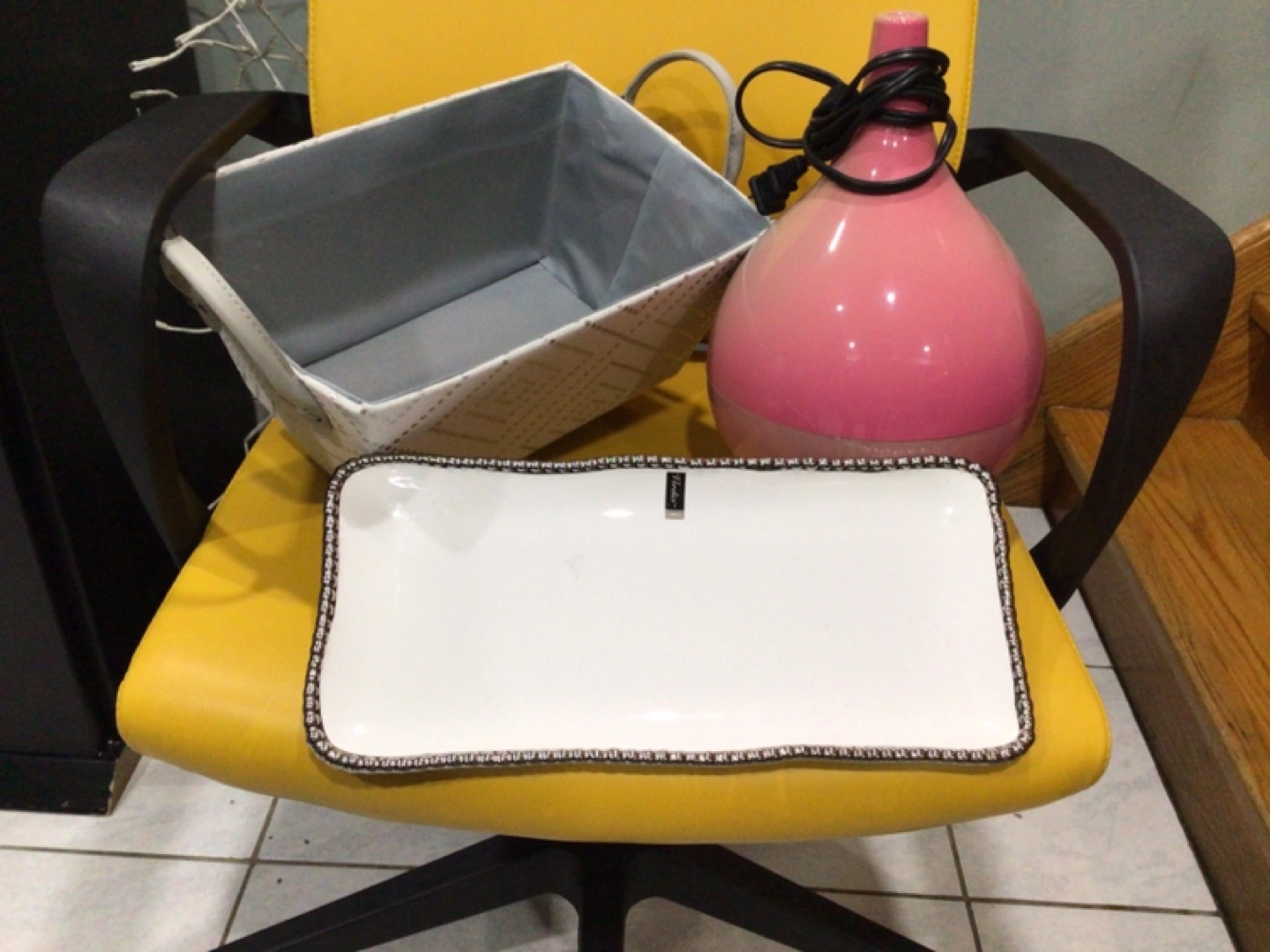 Stylish home decor bundle. Includes a grey fabric storage basket, a white rectangular serving tray with beaded trim, and a pink essential oil diffuser. Great for organizing or adding a touch of elegance.