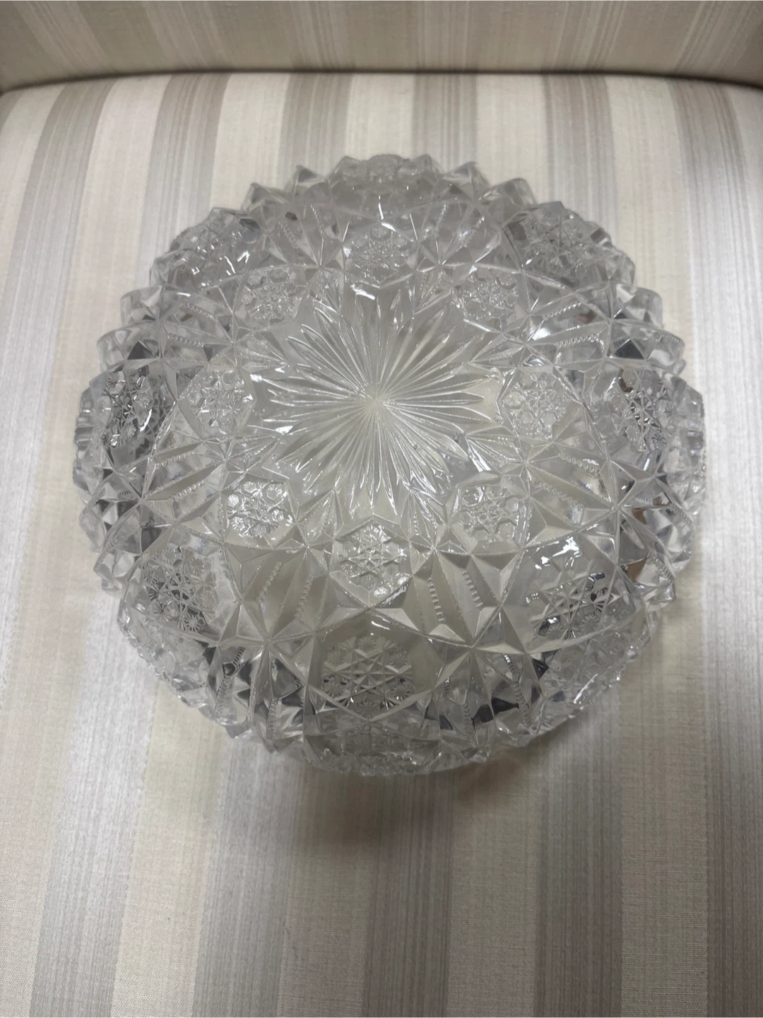 This is a beautiful, clear crystal glass serving bowl. It features intricate, cut glass patterns all around and on the base. Perfect for displaying fruit or serving snacks!