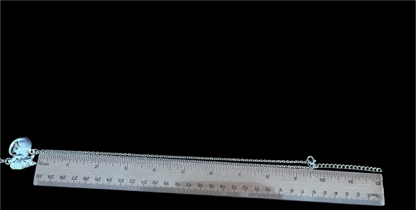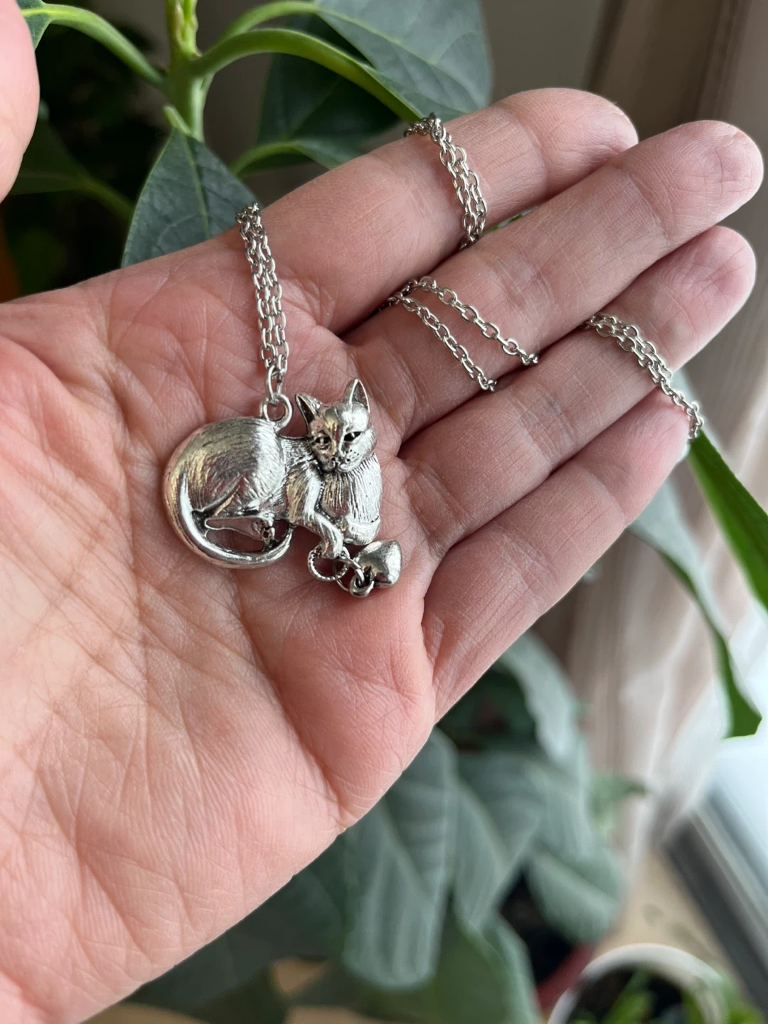 This silver-tone necklace features a detailed cat pendant. The chain is approximately 18 inches long. It's a sweet accessory for cat lovers!
