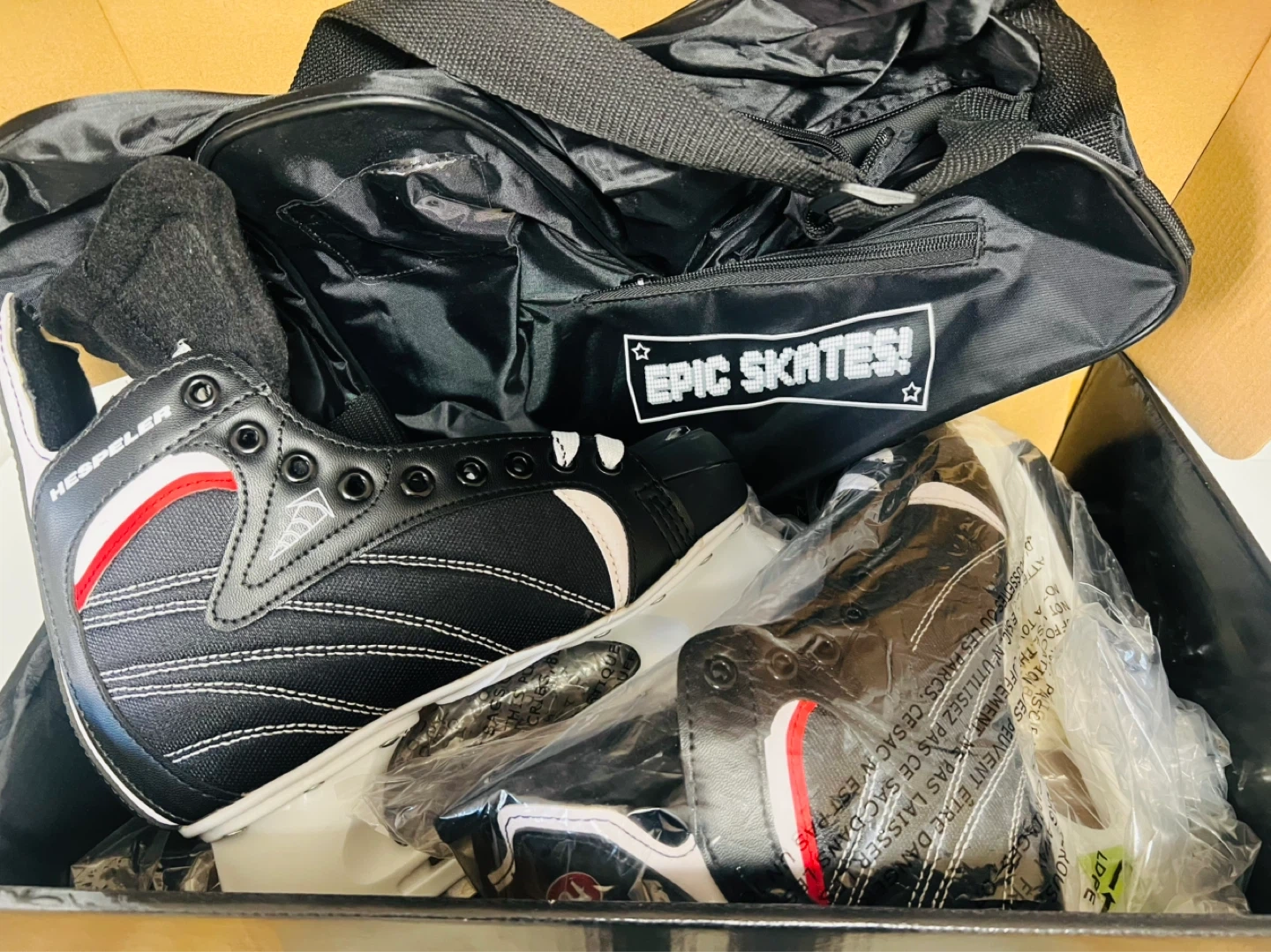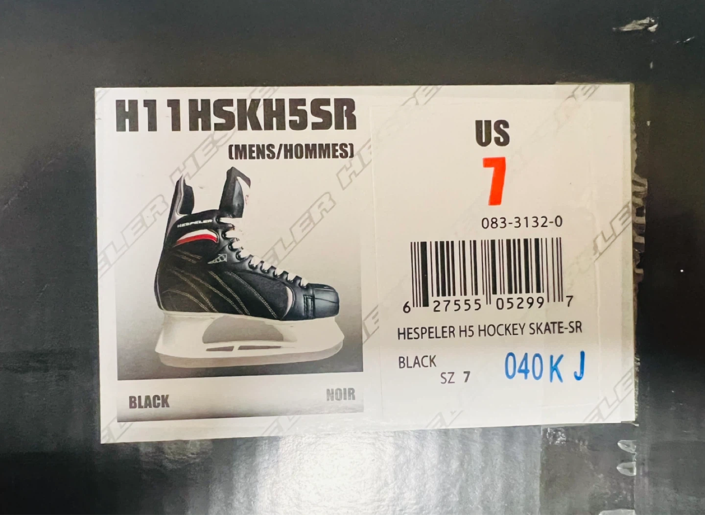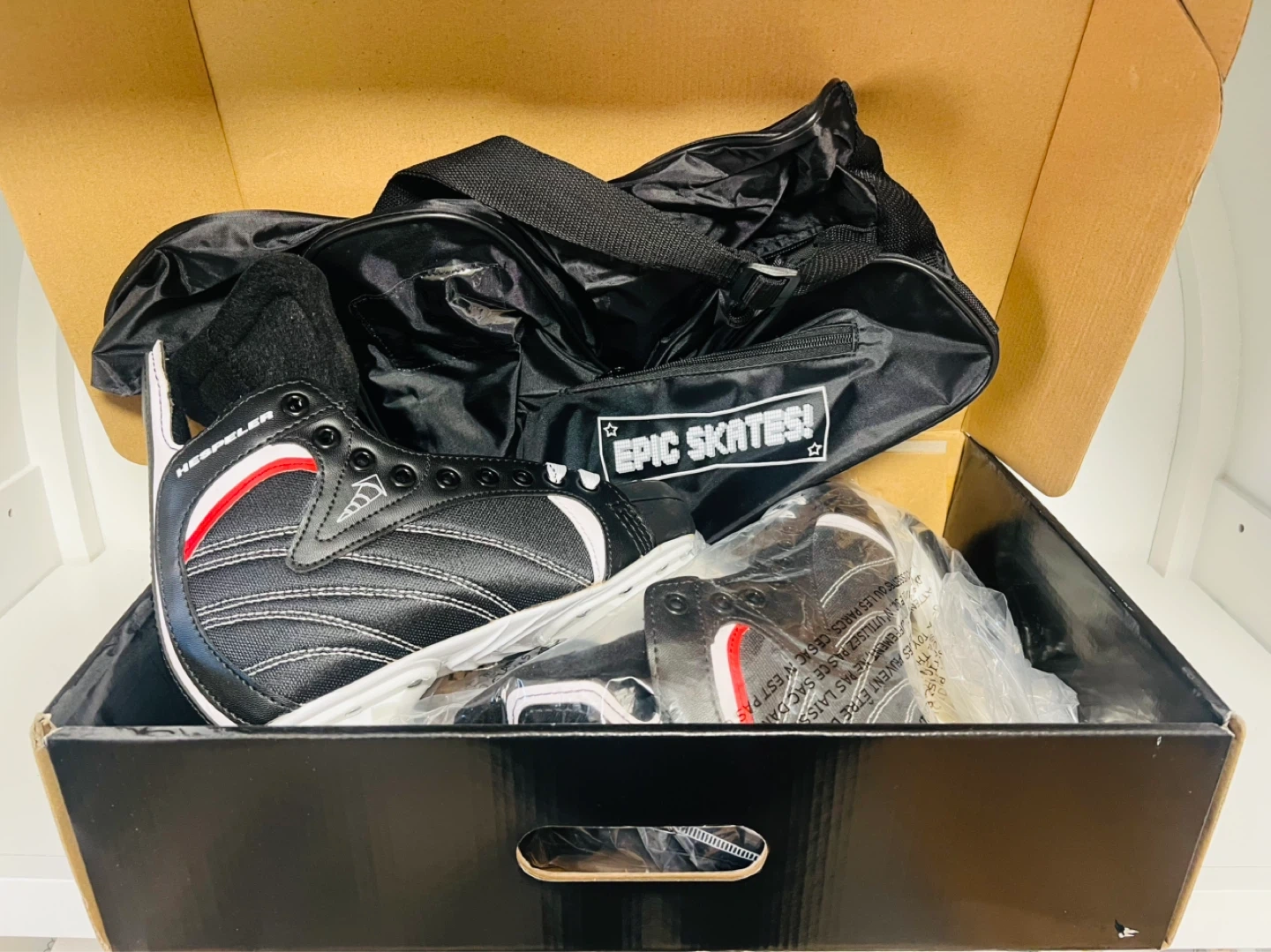 These Hespeler H11 HSKH5SR hockey skates are a size US 7 and come in black. They're designed for men and include a black carrying bag with "Epic Skates!" graphic. Perfect for recreational play!