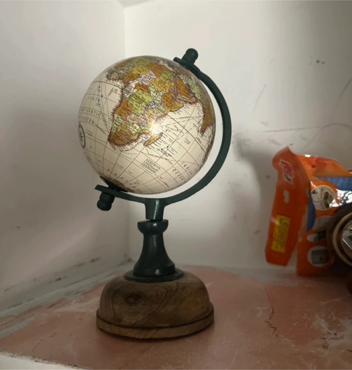 I'm selling a decorative Globe and metal bicycle. It's a charming little piece that would look great on a shelf or desk. The bicycle has a vintage look with wooden handlebars and seat. It's in good condition and ready to add some character to your space