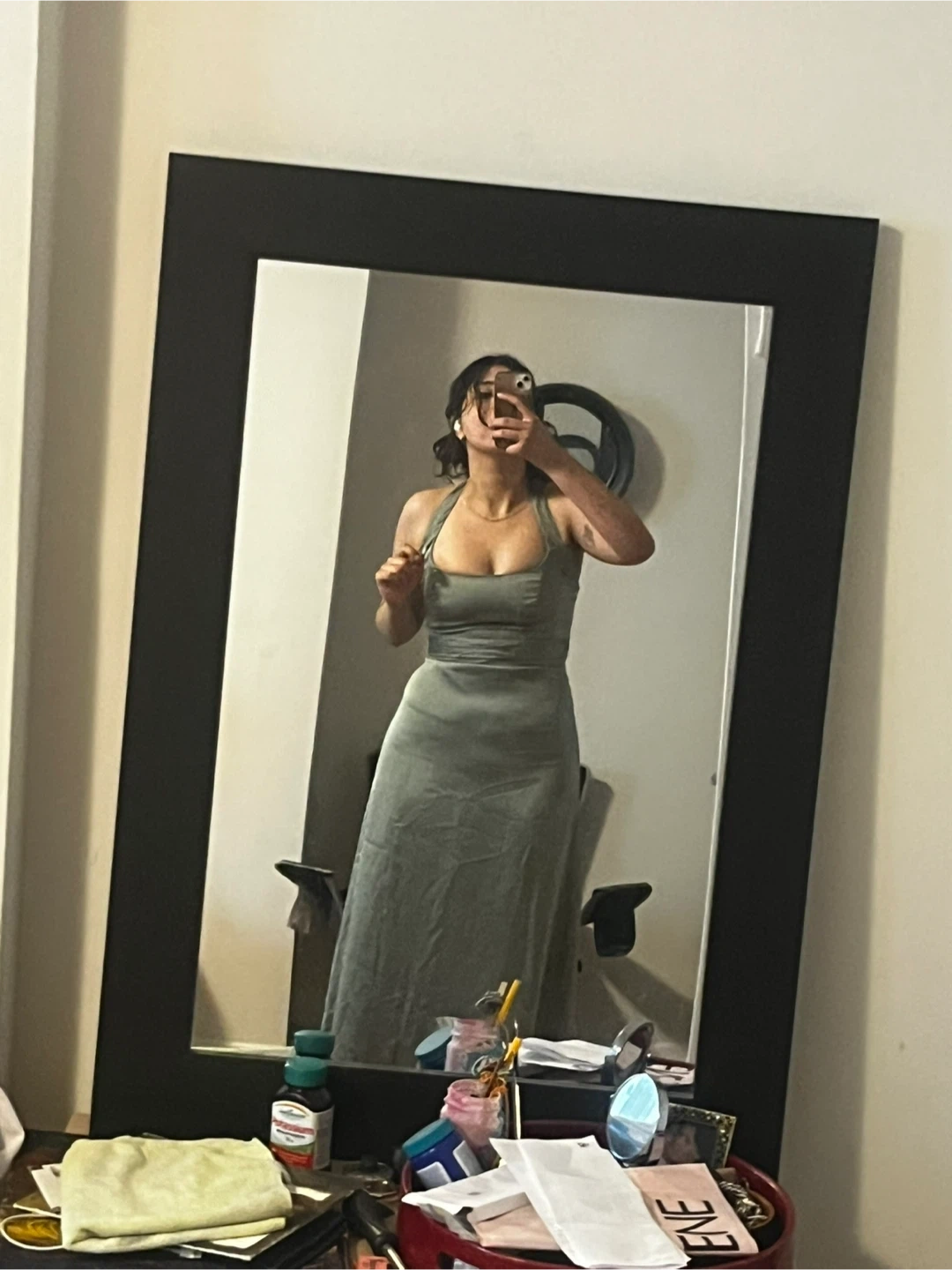 This sage green maxi dress features a flattering silhouette with a square neckline and spaghetti straps. It's made from a smooth, slightly shiny fabric. This dress would be lovely for prom.