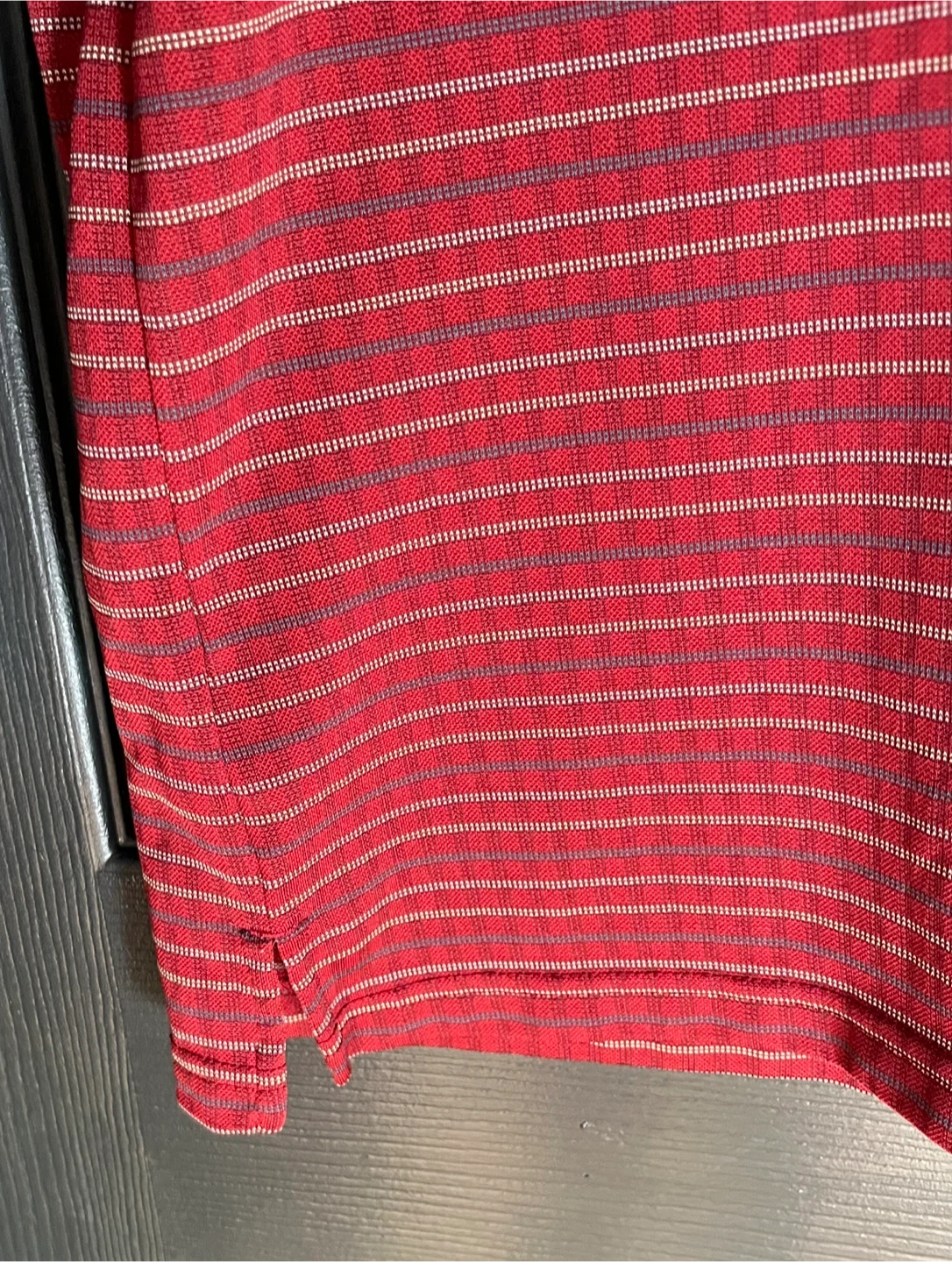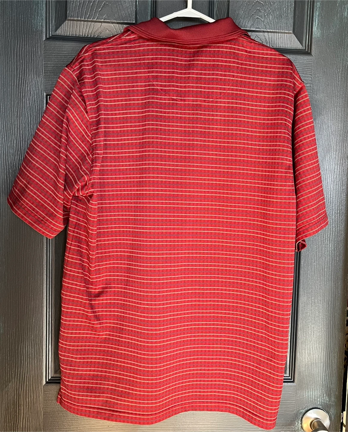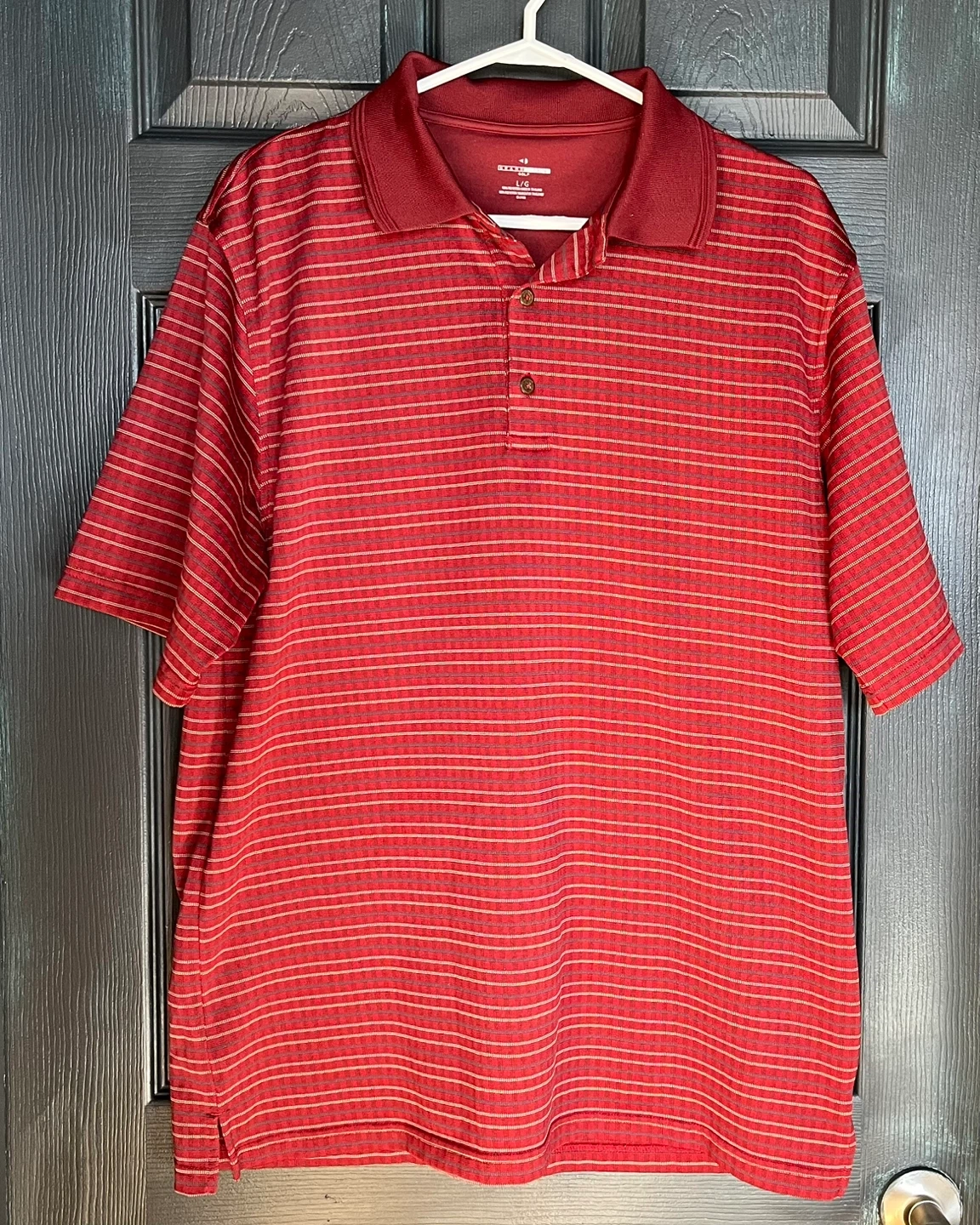 This is a men's Grand Slam Golf polo shirt in red with thin horizontal stripes. It's made of 100% polyester and is a size Large (L/G).