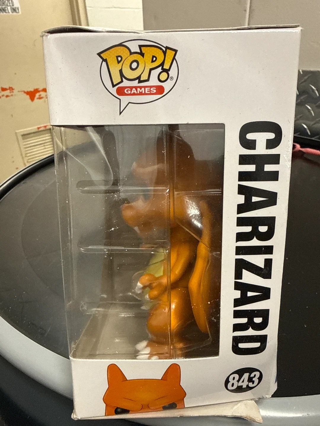 This is a Funko Pop! Games collectible vinyl figure of Charizard, number 843. It comes in its original box. It's made of vinyl.