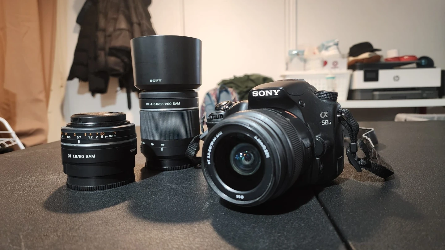 Sony Alpha a58 digital camera with 50mm f/1.8 SAM lens and 18-55mm f/3.5-5.6 SAM lens. Both lenses are in excellent condition. Comes with a lens hood for the 18-55mm lens.