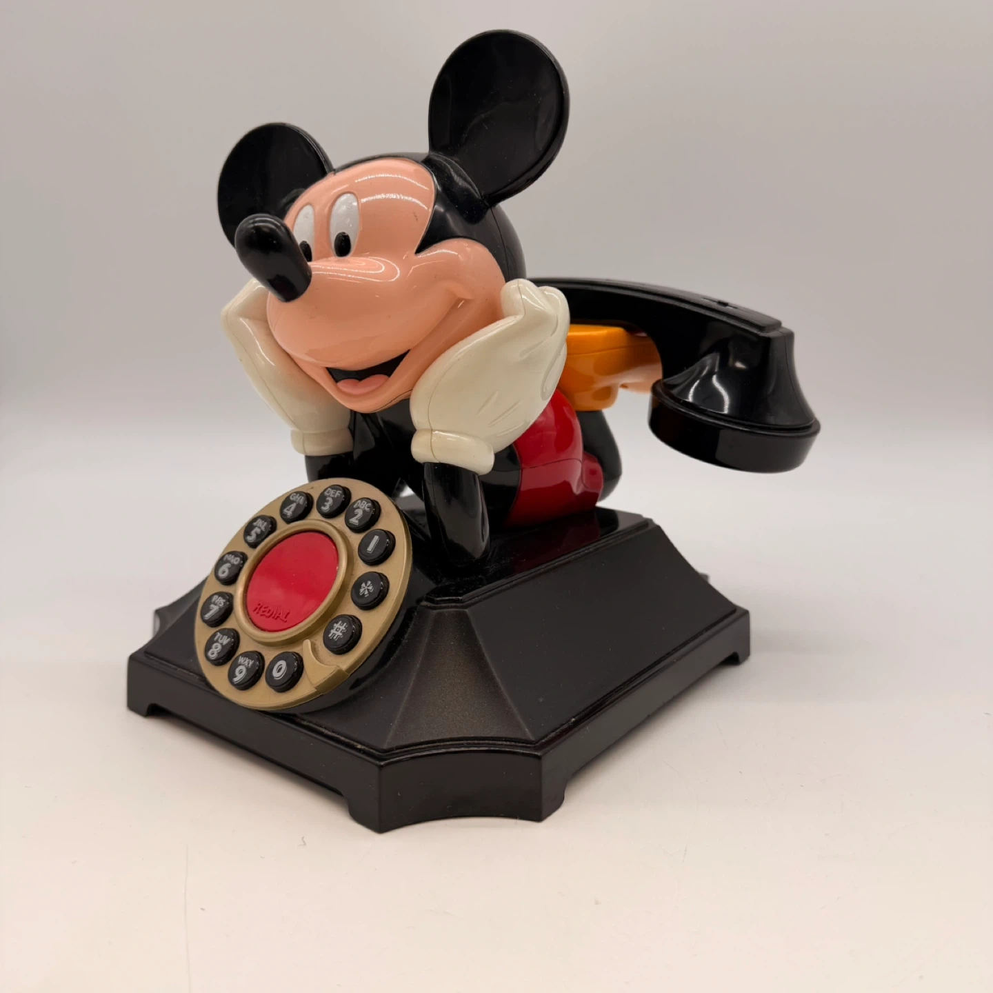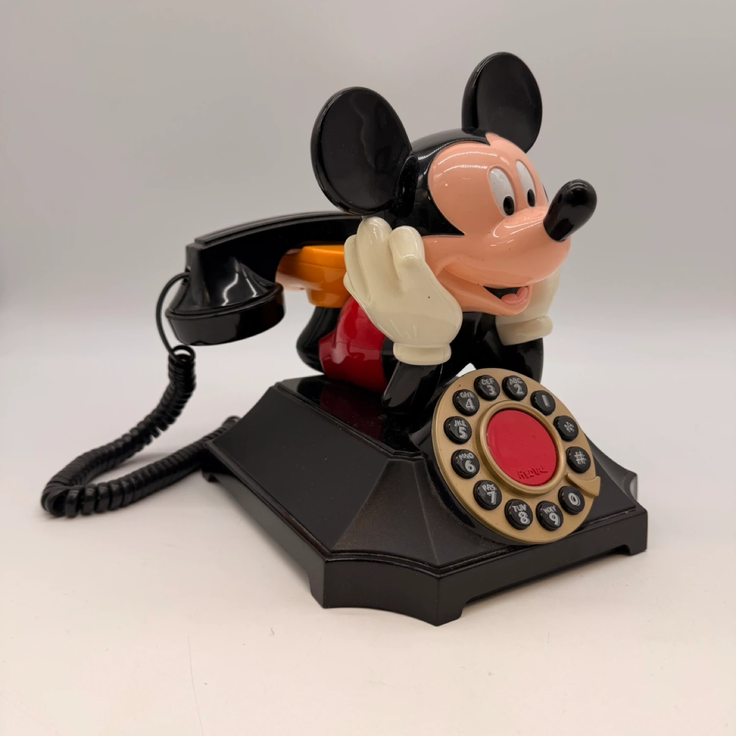 Classic Disney Mickey Mouse desk telephone from the 1990s. Corded landline phone with push-button dial styled like a rotary phone.