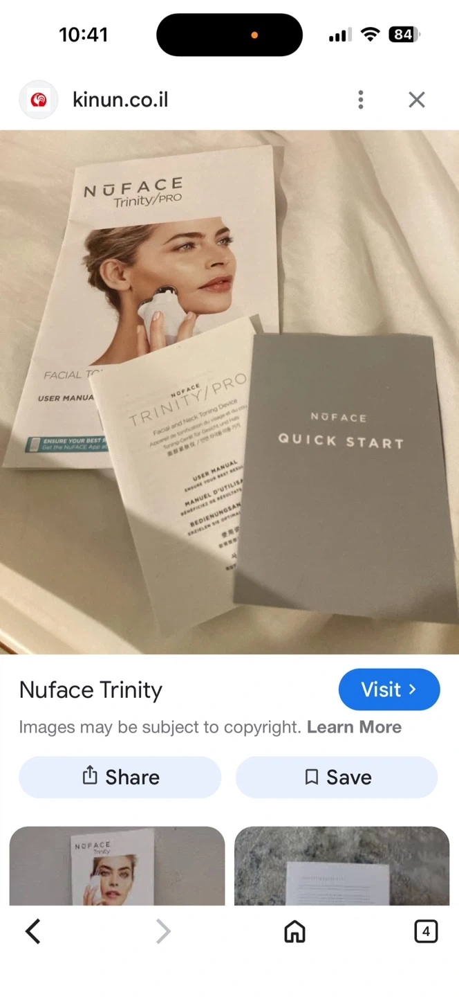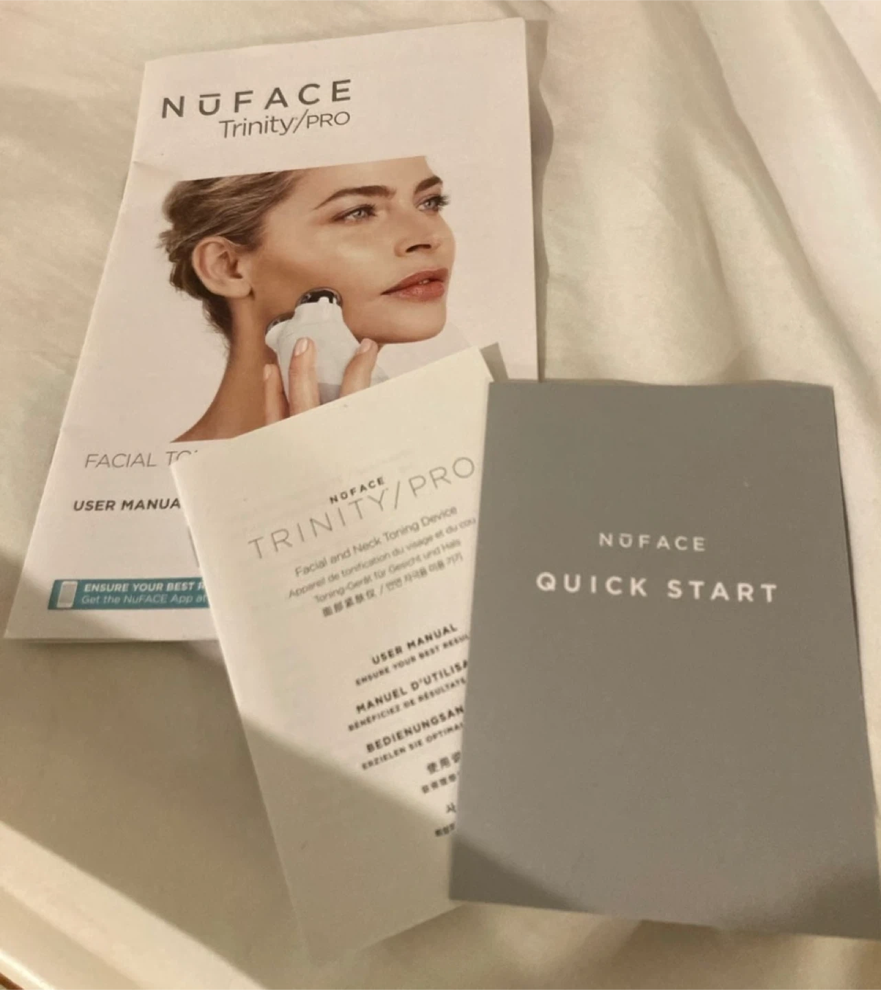 NuFace Trinity Mini device for facial toning. Includes aqua gel and charging accessories. Comes with user manuals and quick start guides.