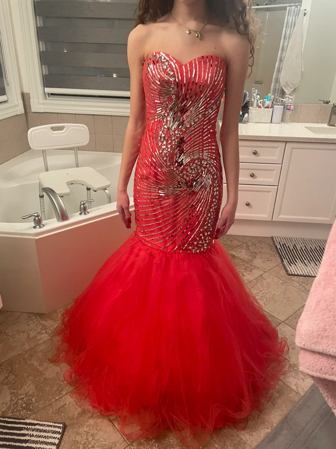Beautiful orange strapless mermaid style prom dress. It has silver detailing on the bodice and a full tulle skirt. Perfect for a special occasion!