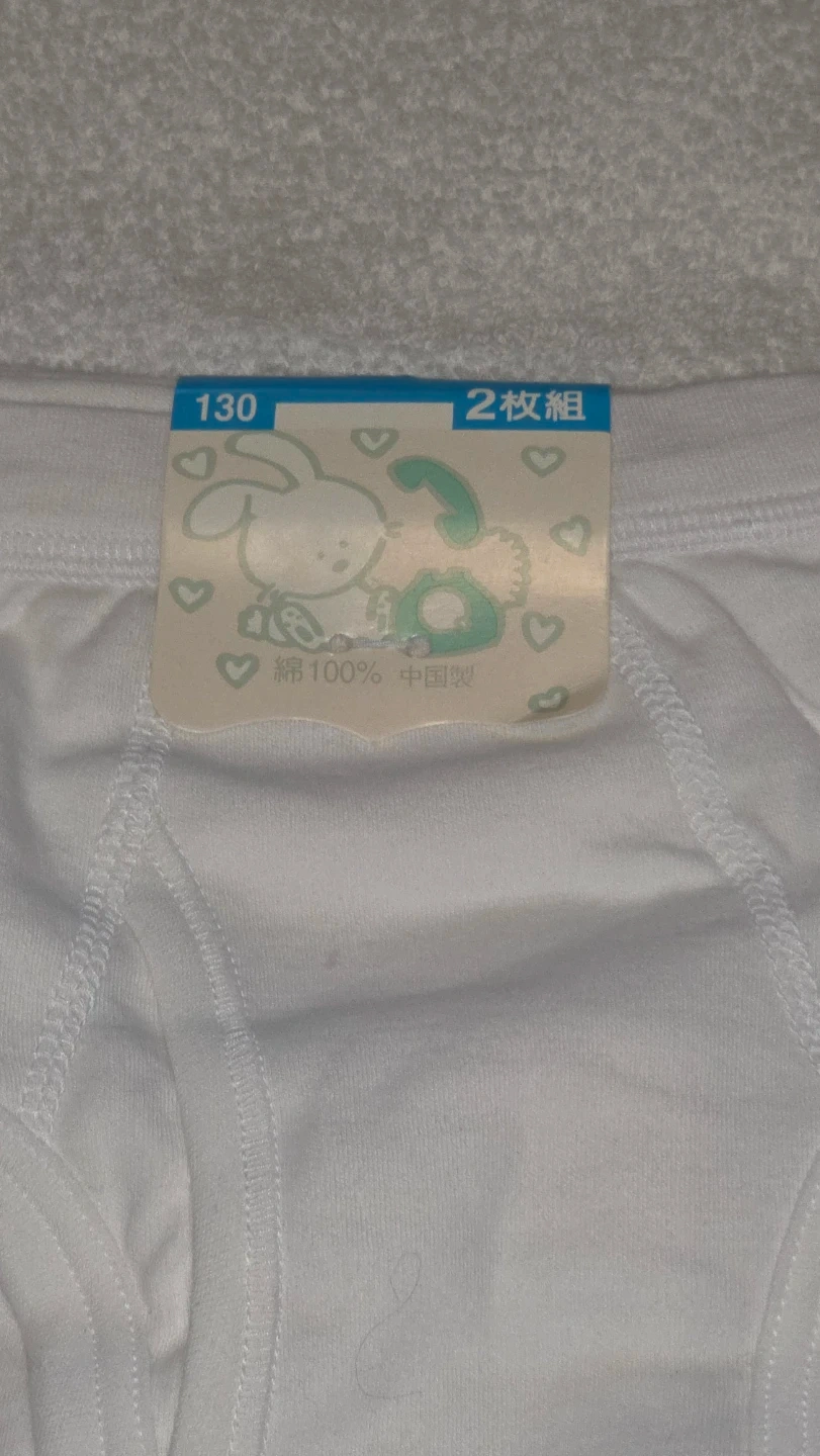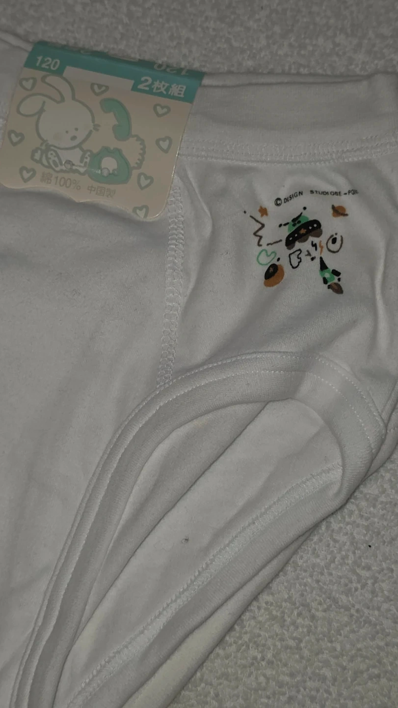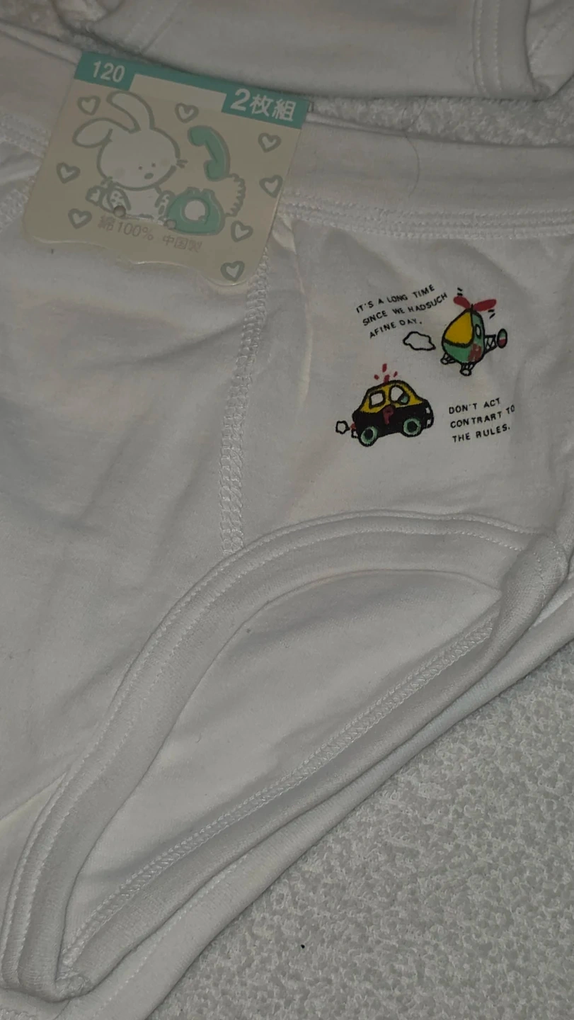 This is a 2-pack of white cotton underwear for kids. Both pairs are size 120 and 130 respectively. (Total 4 pcs) They're made of 100% cotton for comfort. One pair has a car and helicopter graphic, the other has a playful robot design.