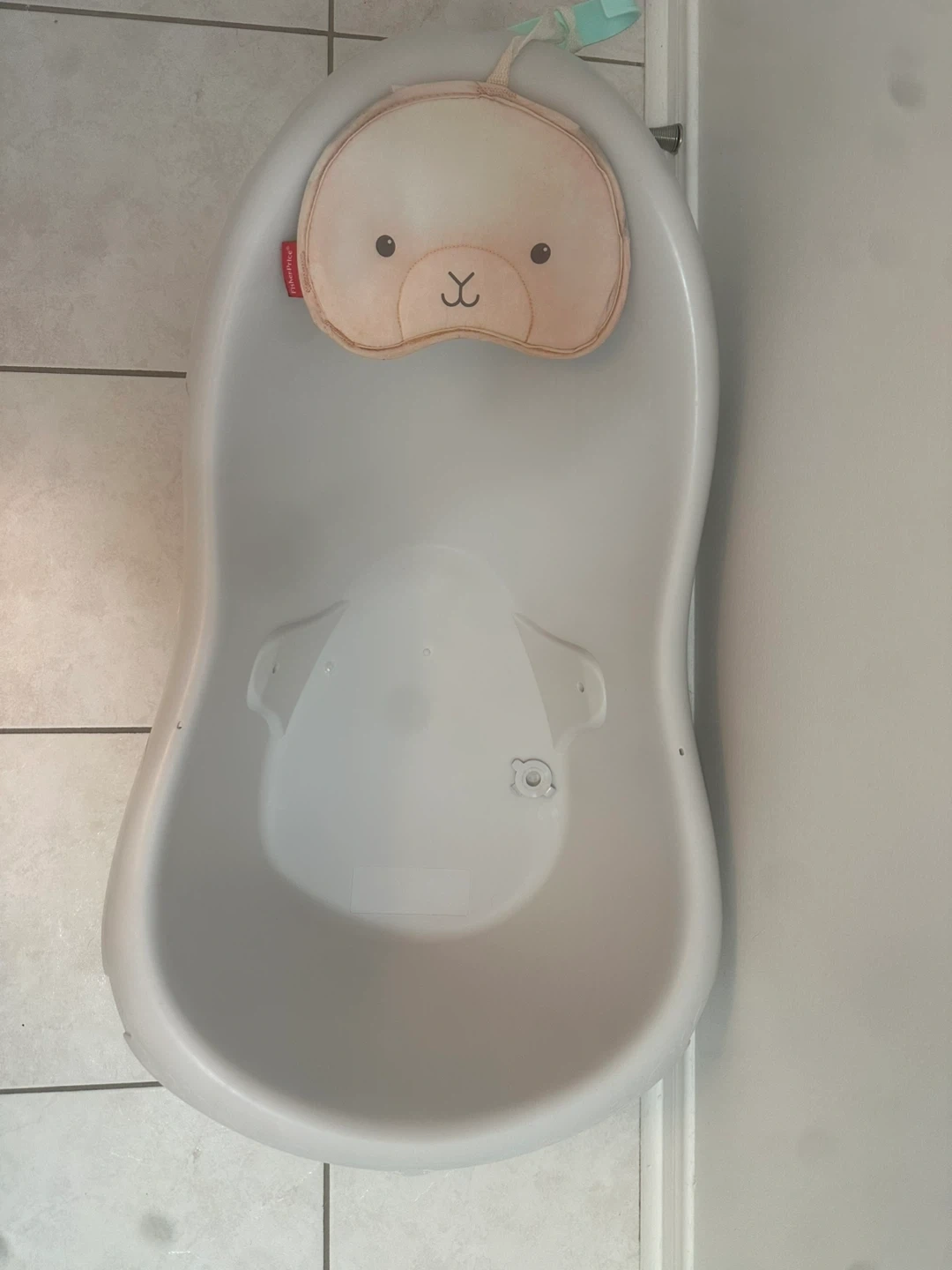 This is a Fisher-Price baby bath tub. It has a soft, removable whale headrest for comfort. The tub's non-slip surface and drain plug make bath time easy and safe. It's designed for newborns and infants.