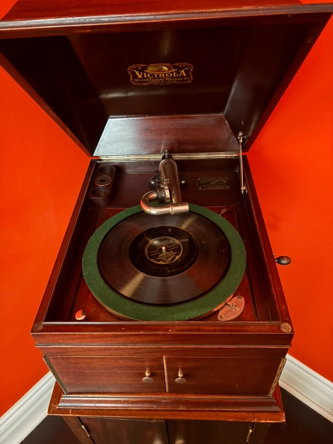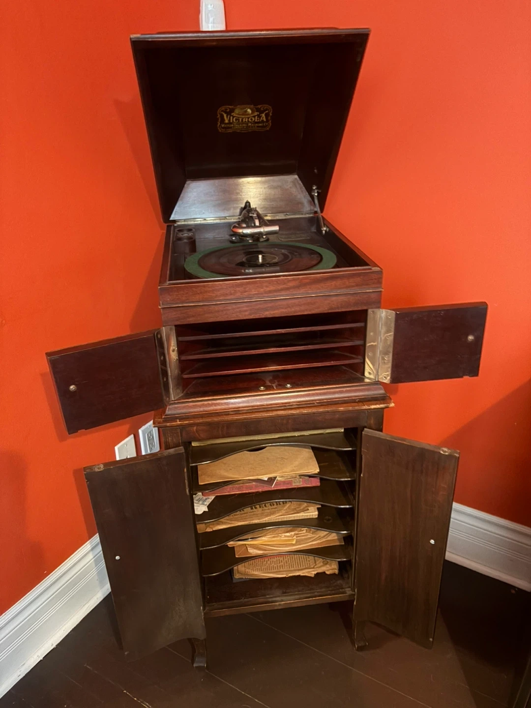 Classic wooden Victrola record player with storage cabinet. Early 1900’s!! Features a hand crank for operation and ample storage for your record collection. A beautiful piece for any music enthusiast!