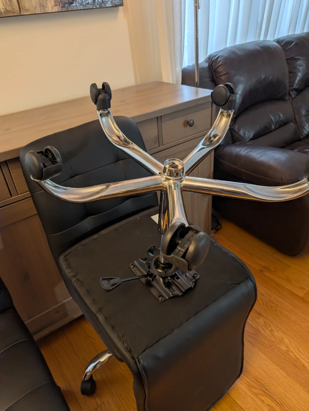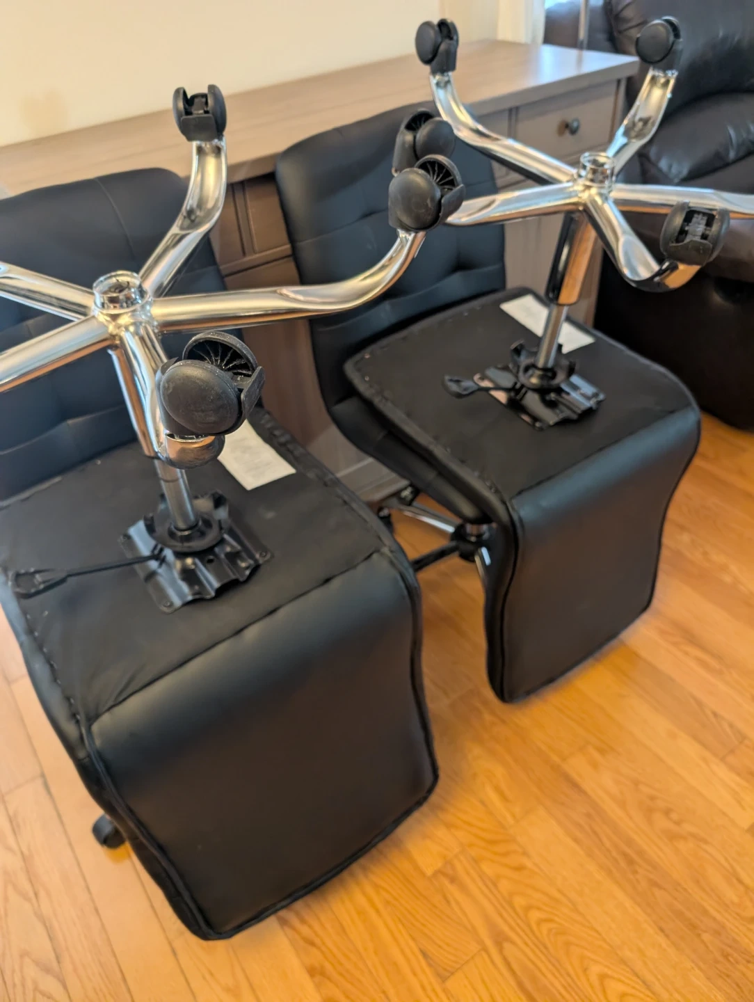 Four black office chairs with tufted upholstery and chrome base. They're equipped with wheels for easy mobility. These chairs are suitable for home or office use.
