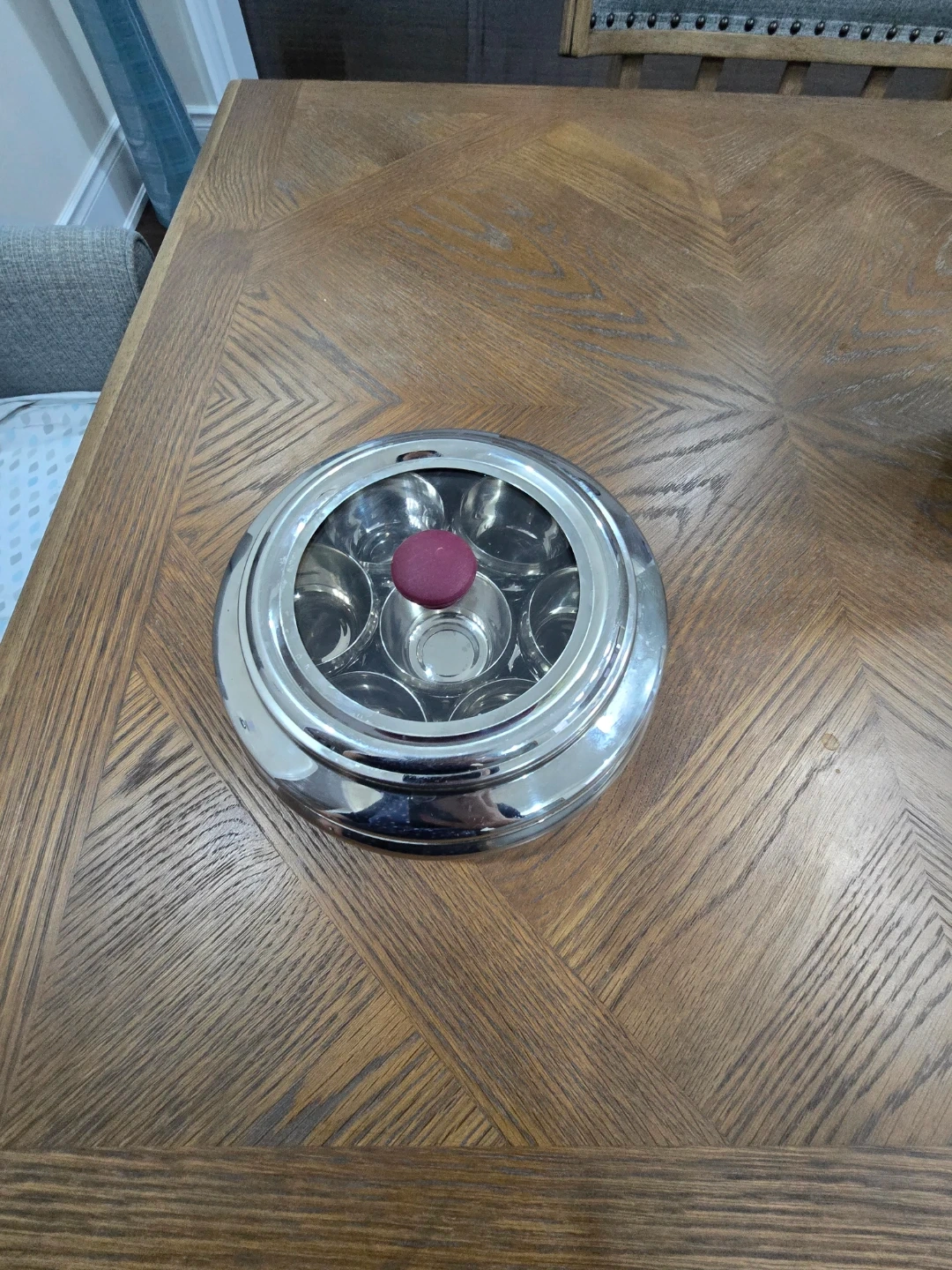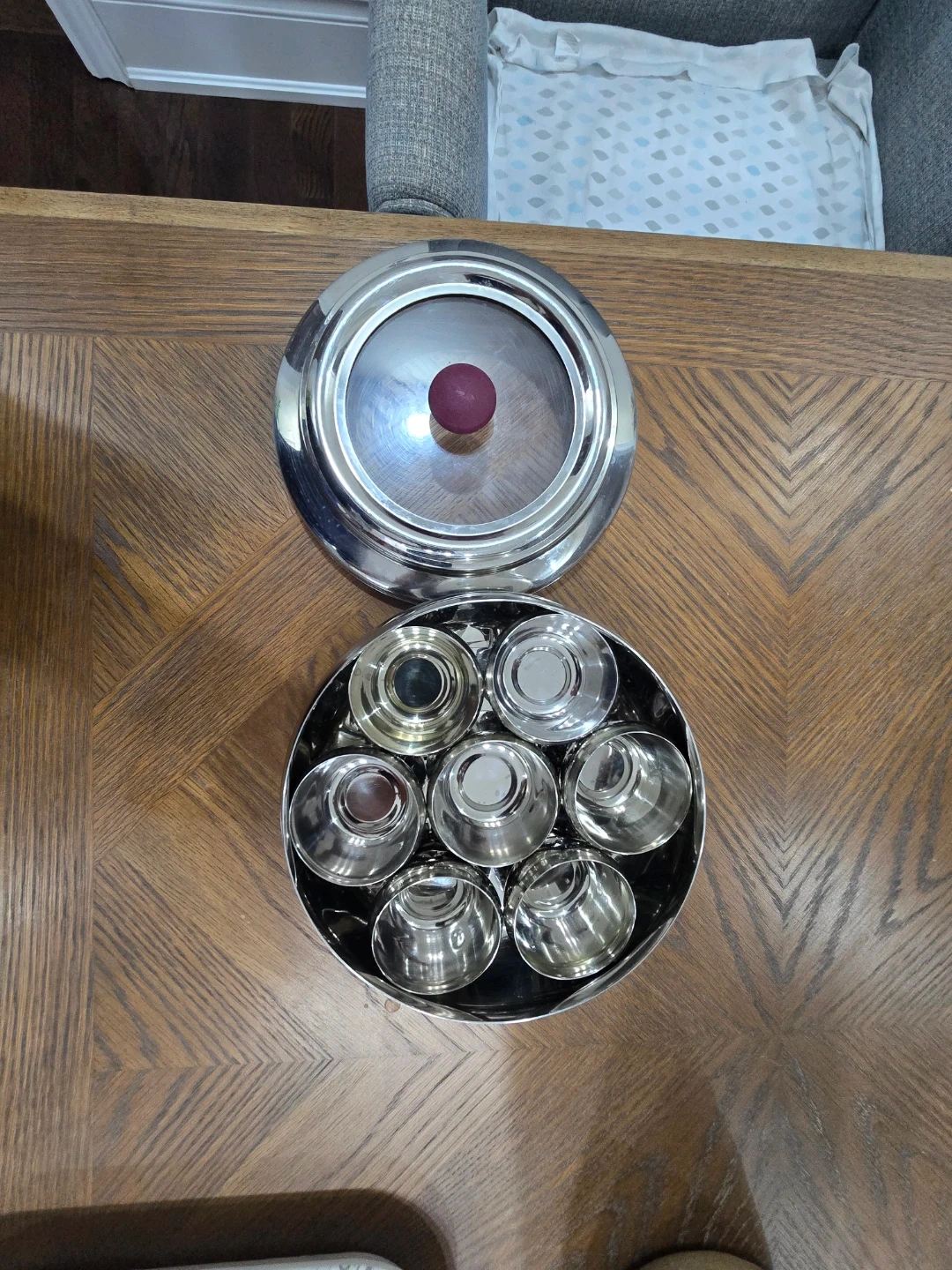 This stainless steel masala dabba spice box comes with seven small bowls and a lid. It's perfect for organizing and storing your favourite spices. The durable stainless steel construction ensures long-lasting use.
