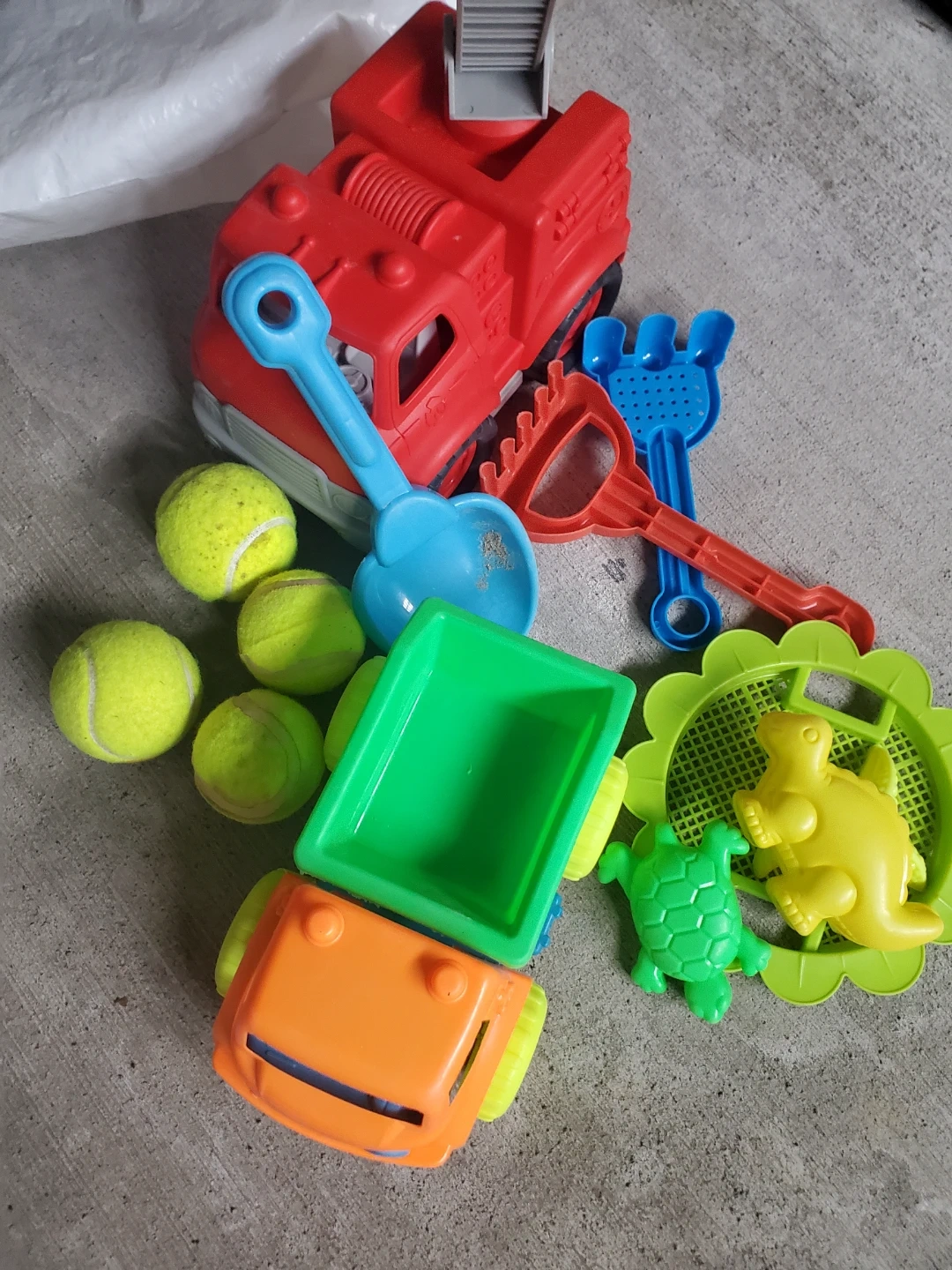 This fun sandbox toy set includes a red truck, a green dump bin, and assorted beach tools like shovels and rakes. It also comes with four yellow tennis balls for extra play. These toys are great for outdoor fun!