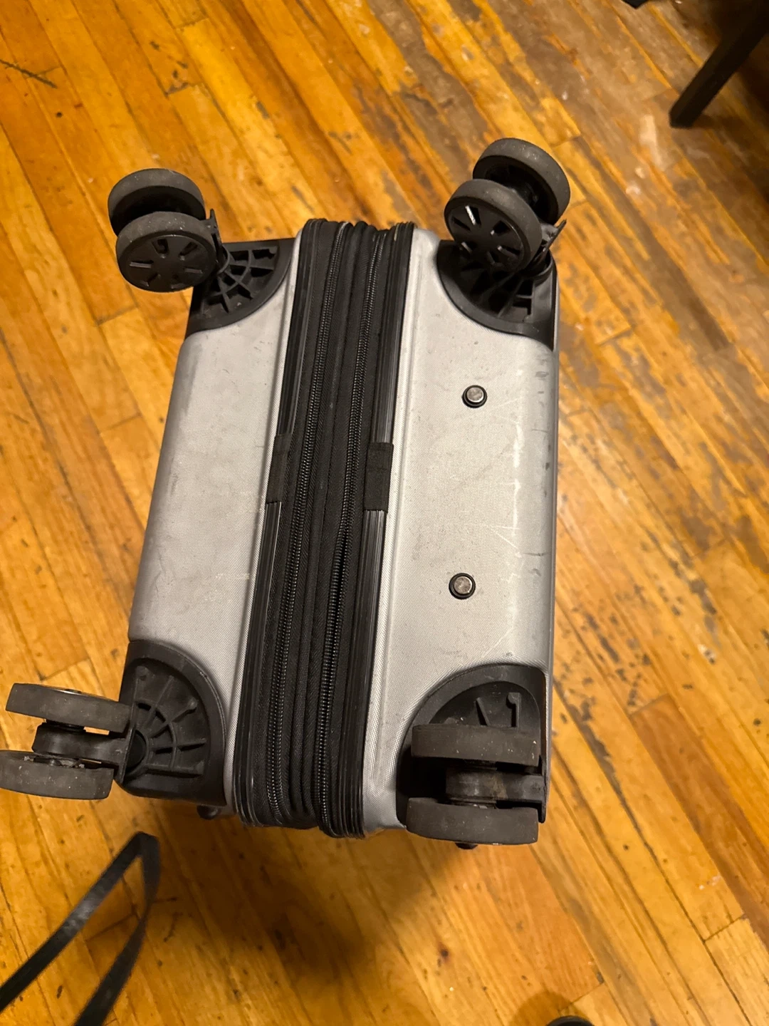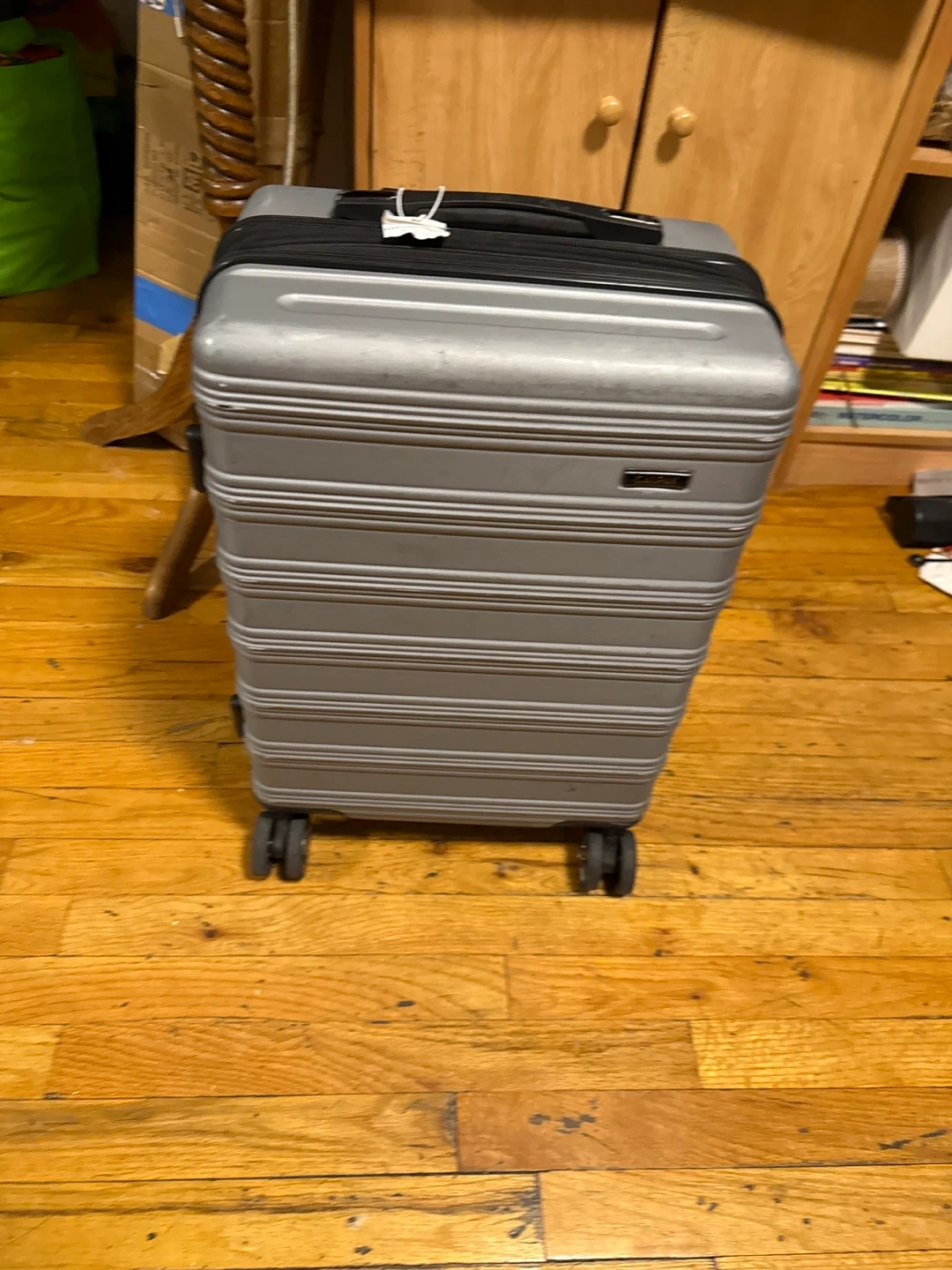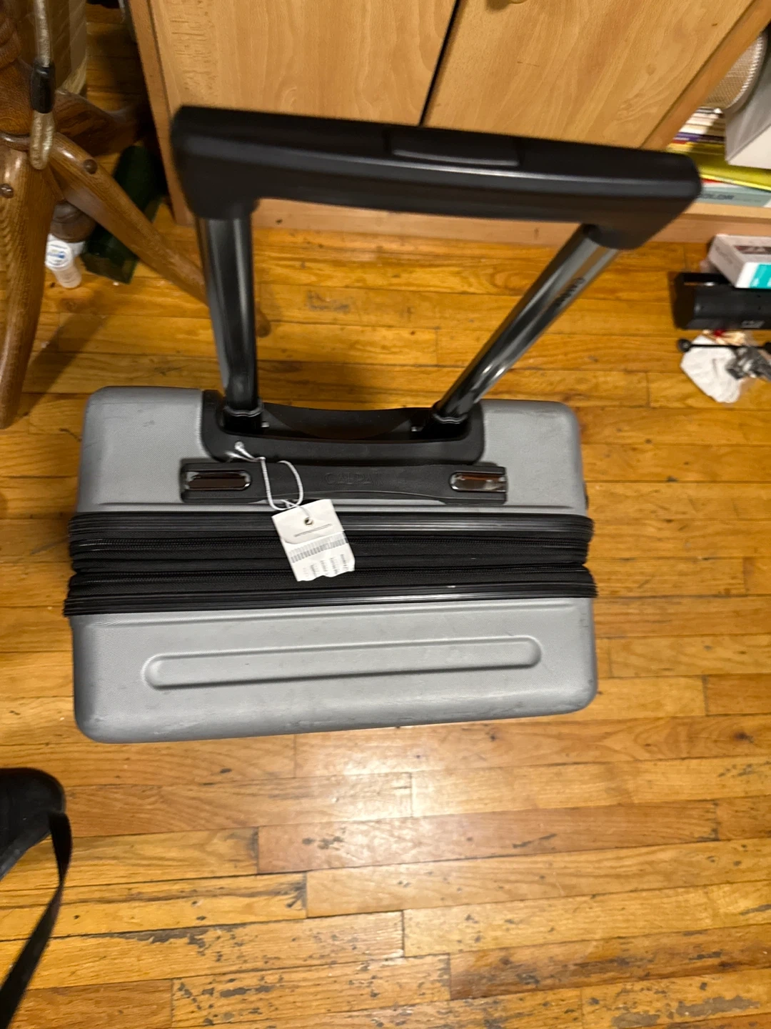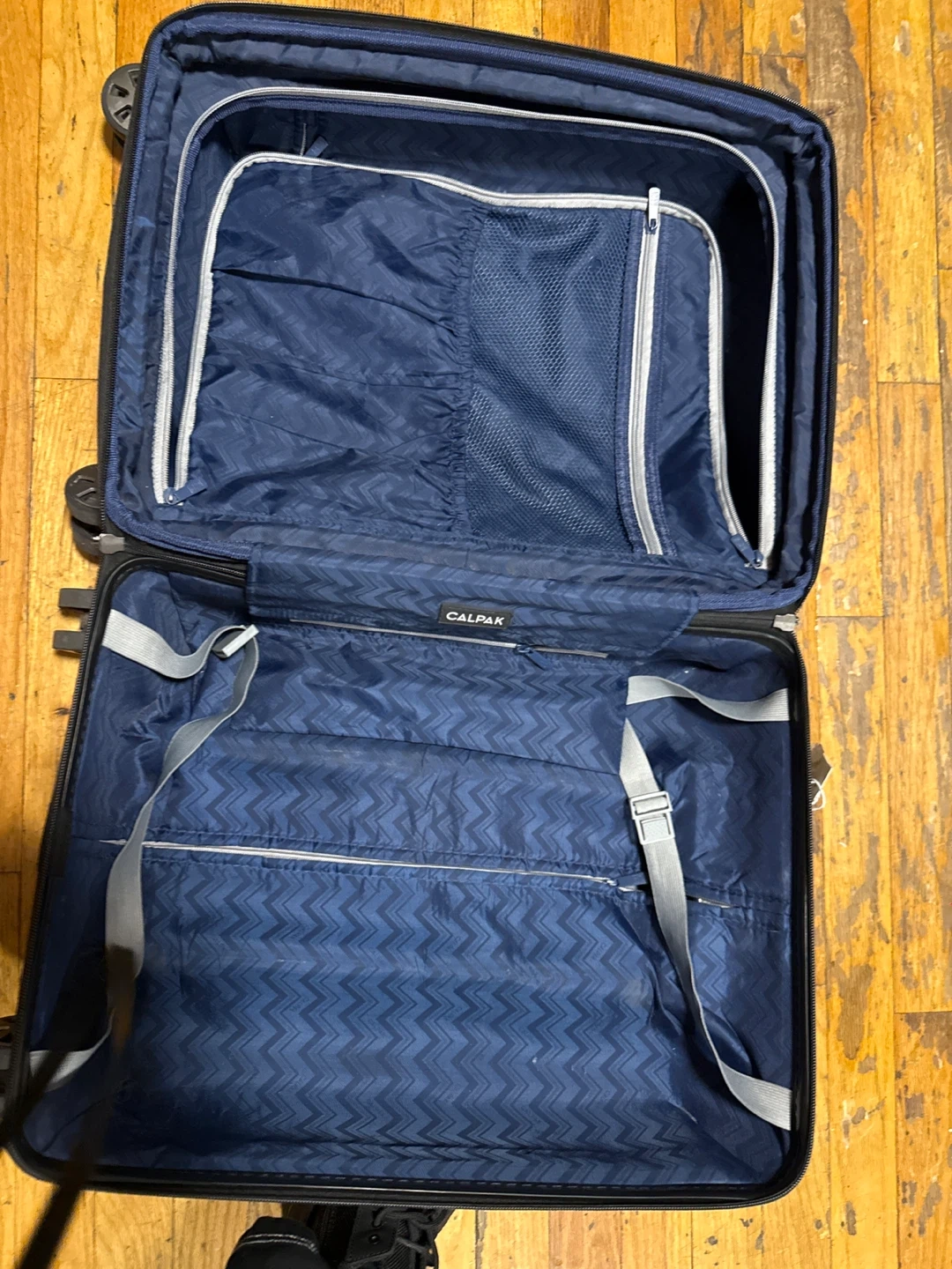 This CALPAK carry-on suitcase is silver with a hardside exterior. It features a telescoping handle and spinner wheels for easy maneuverability. The interior has multiple compartments for organized packing. It's perfect for short trips and weekend getaways!
