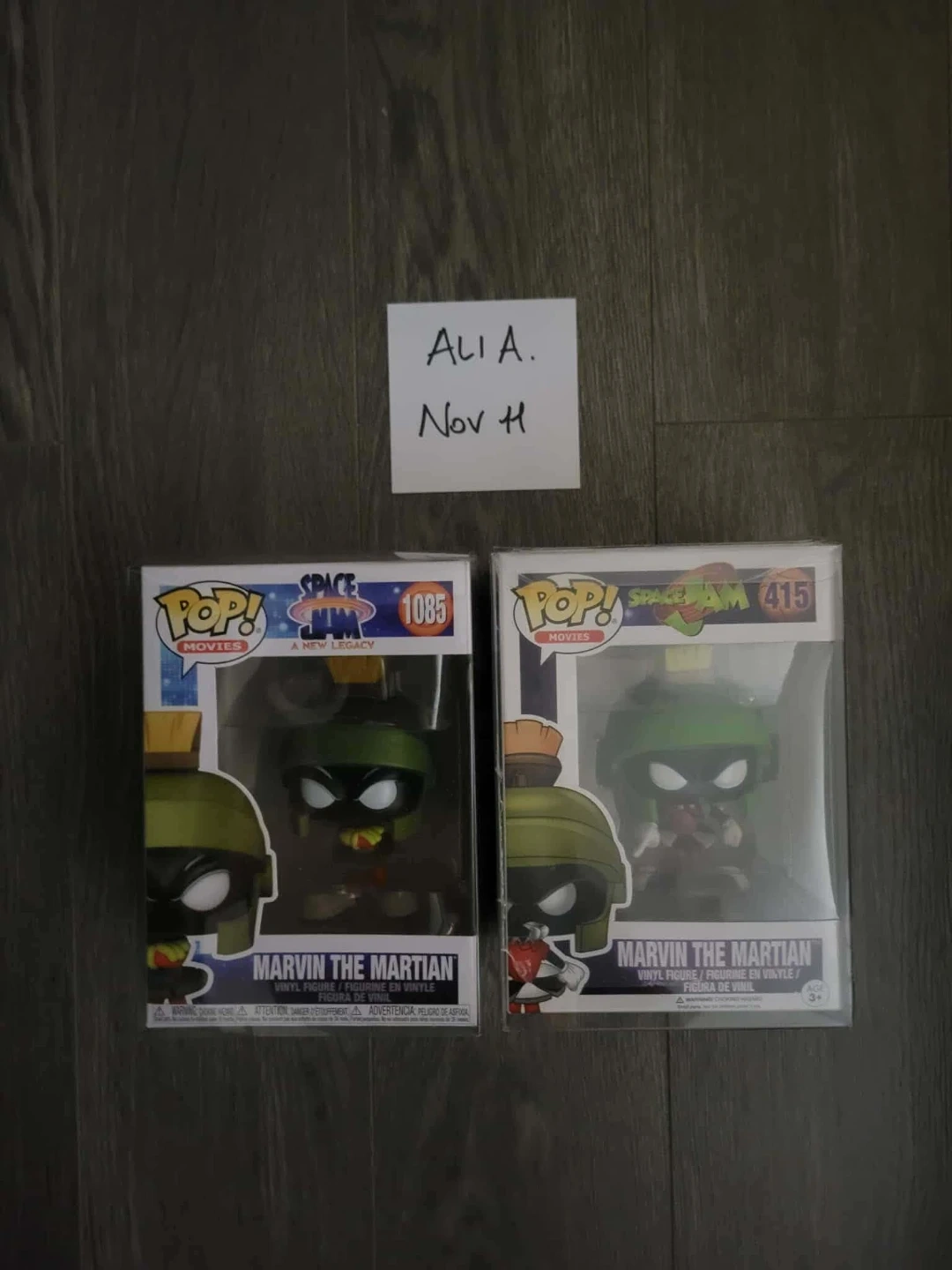 Two Funko Pop! vinyl figures of Marvin the Martian from Space Jam. Includes #1085 (A New Legacy) and #415. Figures are in their original boxes.