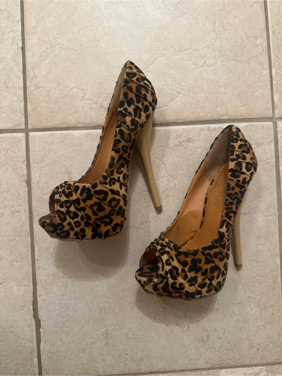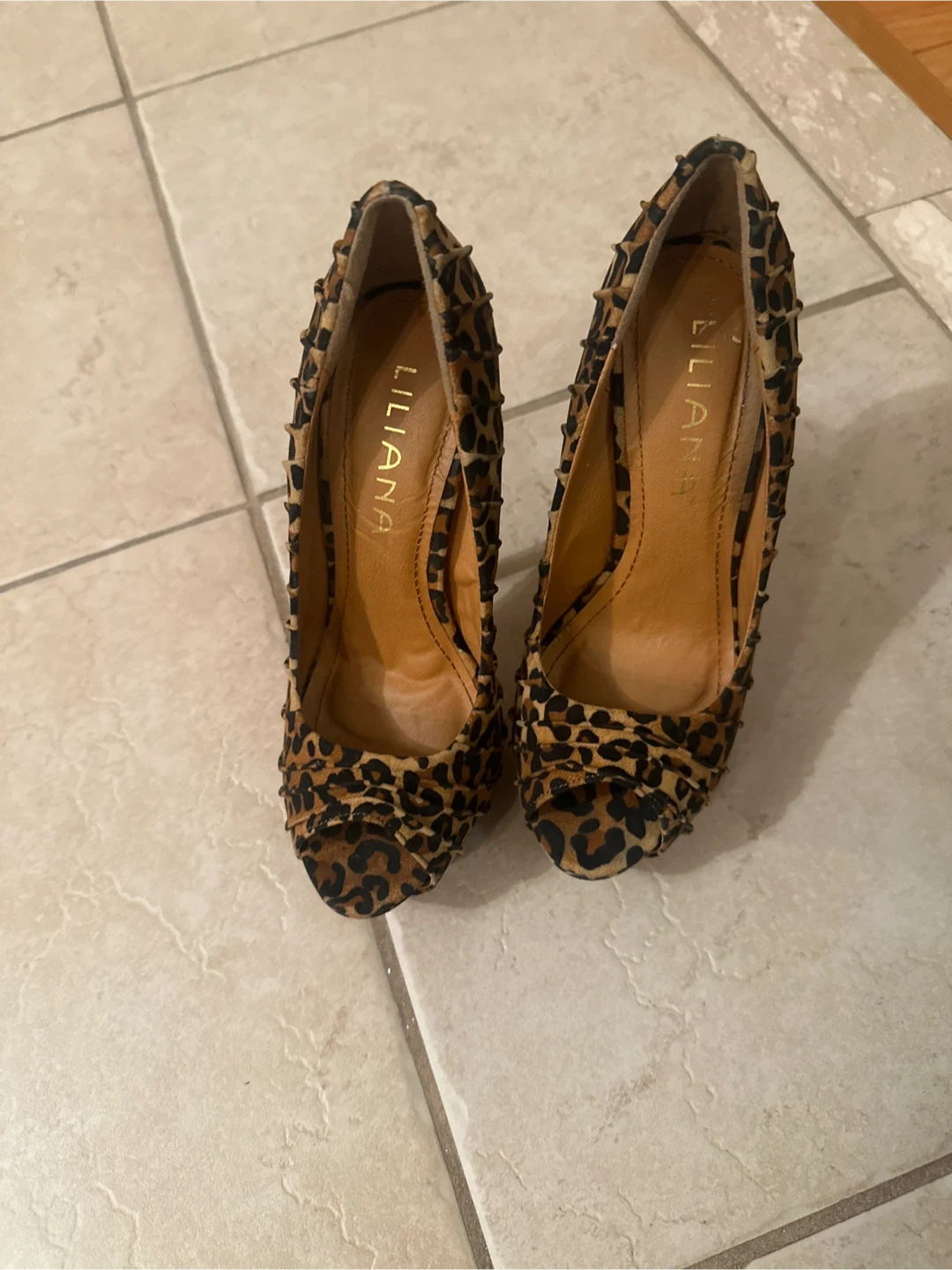 Liliana peep-toe heels with a leopard print. They feature a stiletto heel and studded detailing. Made with synthetic materials.