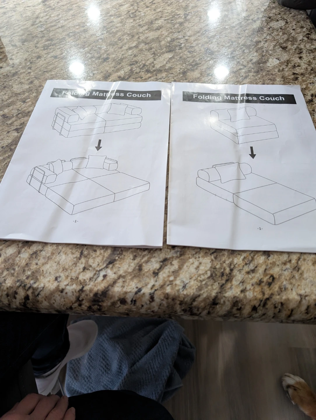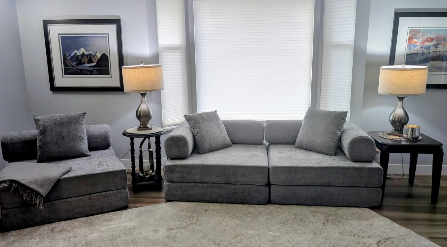 This set includes a modular sofa and a chaise lounge in a soft grey fabric. The pieces are upholstered and come with throw pillows. It's a comfortable and versatile seating arrangement.