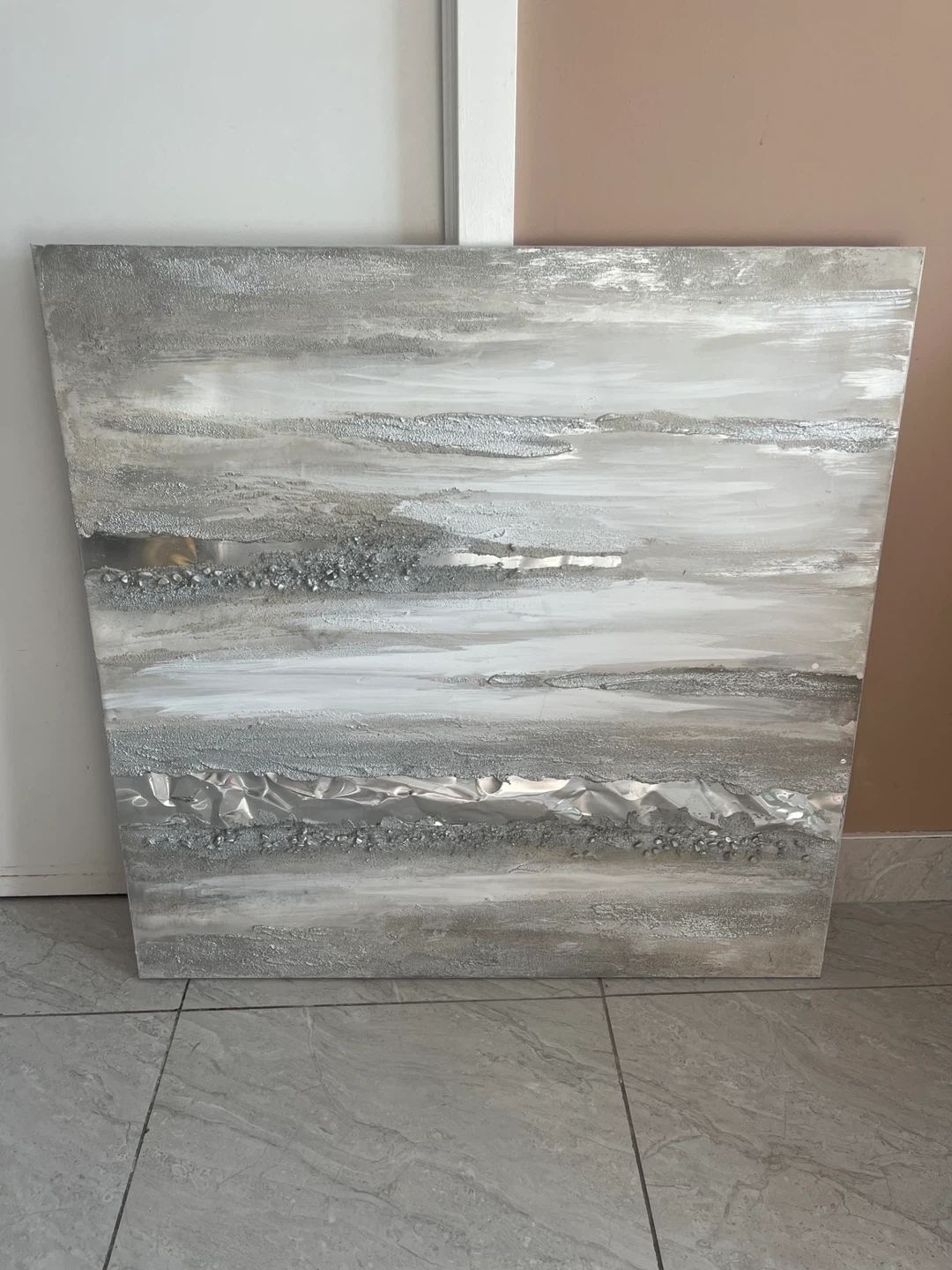 This canvas wall art features a textured abstract design in shades of grey, white, and silver.