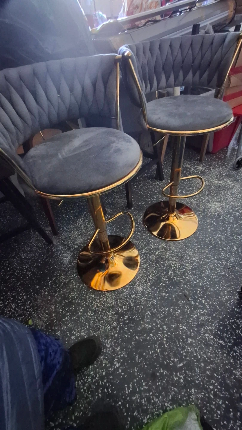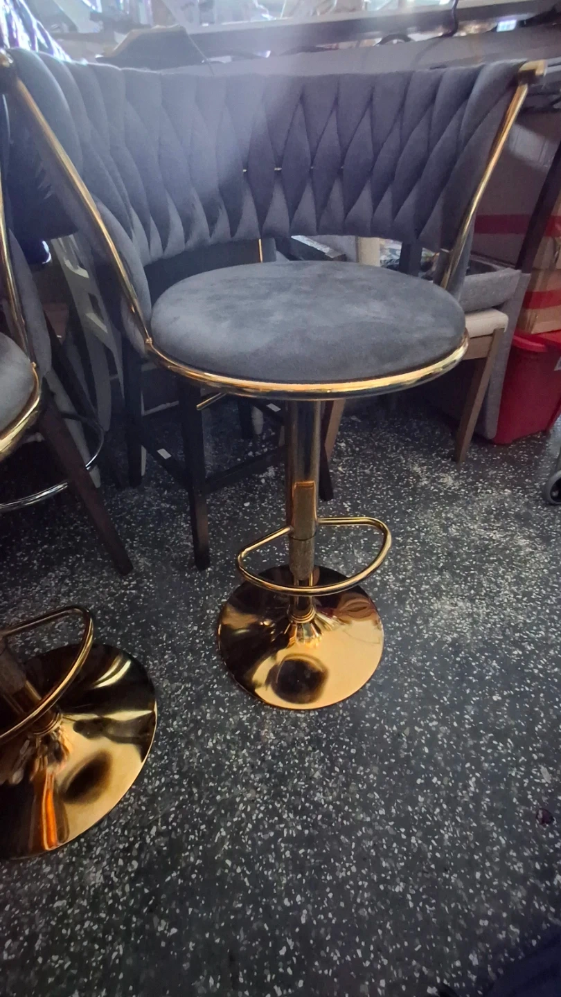 Adjustable Grey Velvet Bar Stool with Gold Base
