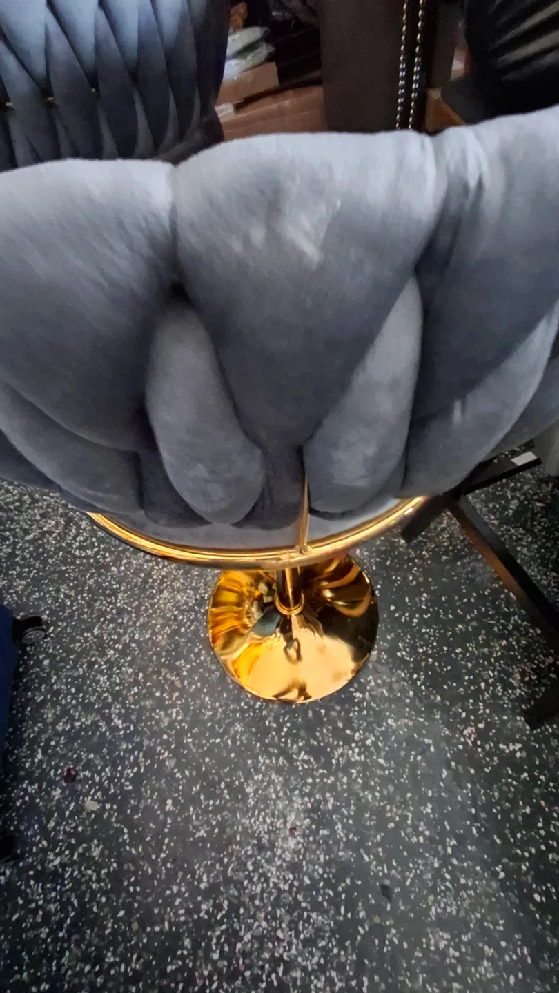 Plush grey velvet bar stool with a diamond-tufted backrest and a polished gold adjustable pedestal base. This stool features a built-in footrest for added comfort. Its height is adjustable, making it a versatile seating option for your kitchen counter or bar area. It's great for adding a touch of modern glam to your